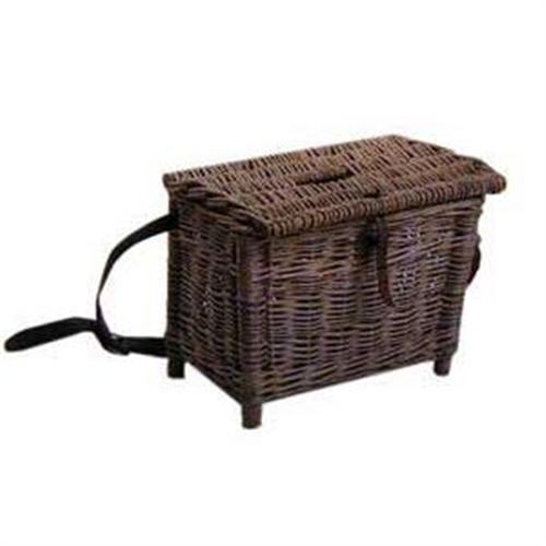A sturdy fishing basket with a wooden interior frame, designed to store the day's catch and serve as a stool! Circa 1920.