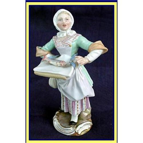 <table width="100%" border="0" cellspacing="0" cellpadding="4"><tr><td><em> </em></td></tr><tr> <td width="100%"> Meissen porcelain figurine of a lady fishmonger, Germany, 19th century. One of the Street sellers of Paris series and a variation of the figure modelled by Reinicke in 1757. 5 1/2inches high. She stands with arms akimbo, her head tied in a scarf, holding a tray with a fish and a basket of fish bits on one hip. Super, super detail of painted clothes, face, modelling of upturned old shoes. Marked underneath with blue crossed swords, impressed 30 and 11. The blue ribbon holding her tray has been restored. No other damage to be seen. </td></tr><tr> <td> </td></tr><tr> <td>Reference #: 1312</td></tr><tr><td>Condition:See Description</td></tr><tr><td>Year:See Description</td></tr><tr><td>Title:FISHMONGER MEISSEN PORCELAINE FIGURINE 19C</td></tr><tr><td>Location:Boca Raton</td></tr></table>
