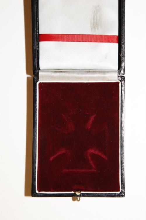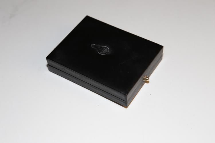 FITTED NAZI IRON CROSS 2 HARD SHELL CASE---DARK LEATHERETTE CASE FOR THE NAZI IRON CROSS ll--POST WAR COPY--EXTREMELY WELL MADE--2 3/4" X 3 3/4" X 7/8"-- FADED INSIGNIA ON TOP OF CASE--INSIDE BOTTOM RED VELOUR FITTED FOR EKII-TOP IS WHITE WITH RETENSION BANDS FOR RIBBON-PUSH BUTTON OPENING RELEASE THAT WORKS