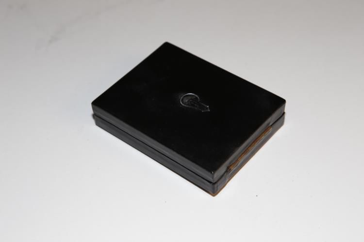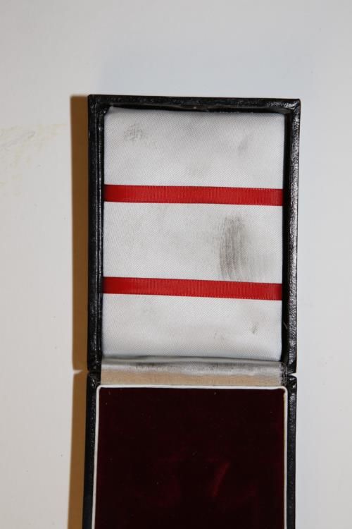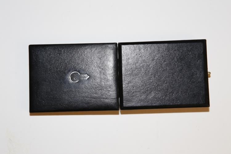FITTED NAZI IRON CROSS 2 HARD SHELL CASE---DARK LEATHERETTE CASE FOR THE NAZI IRON CROSS ll--POST WAR COPY--EXTREMELY WELL MADE--2 3/4" X 3 3/4" X 7/8"-- FADED INSIGNIA ON TOP OF CASE--INSIDE BOTTOM RED VELOUR FITTED FOR EKII-TOP IS WHITE WITH RETENSION BANDS FOR RIBBON-PUSH BUTTON OPENING RELEASE THAT WORKS