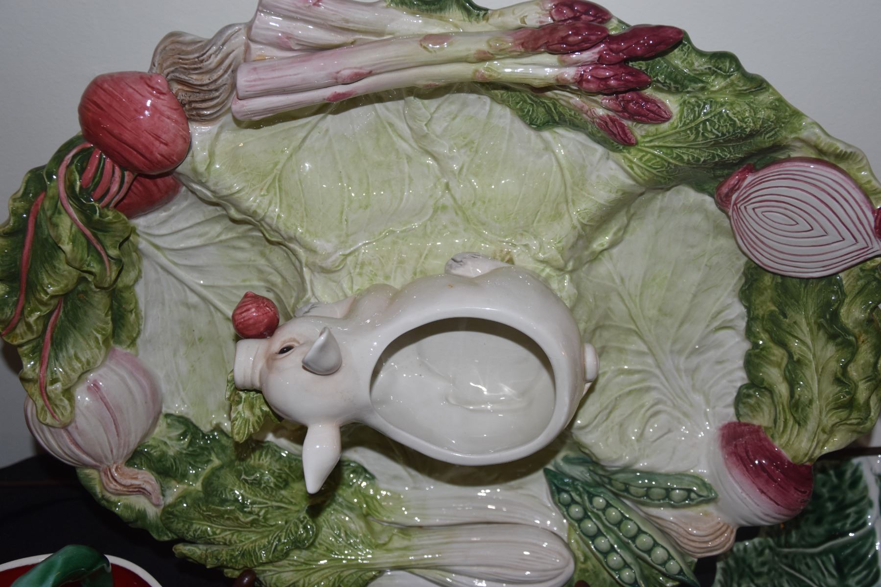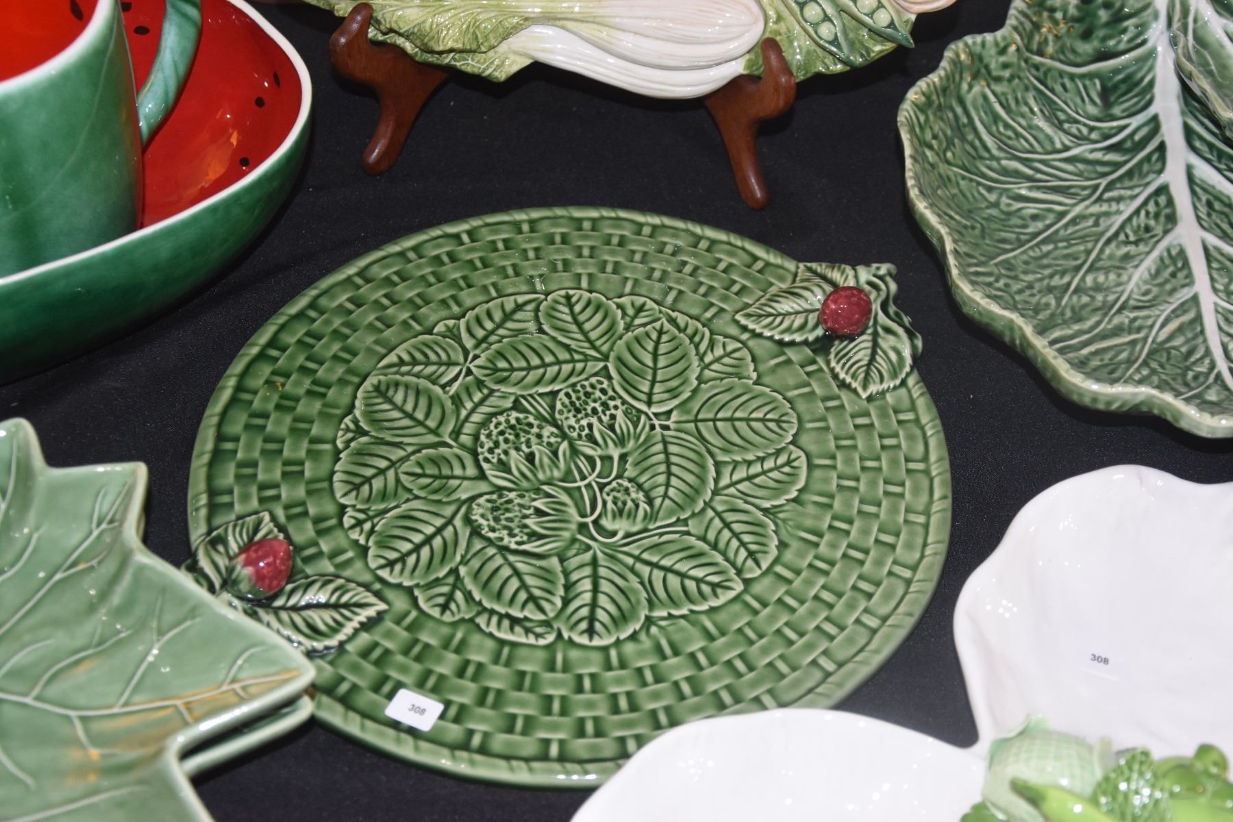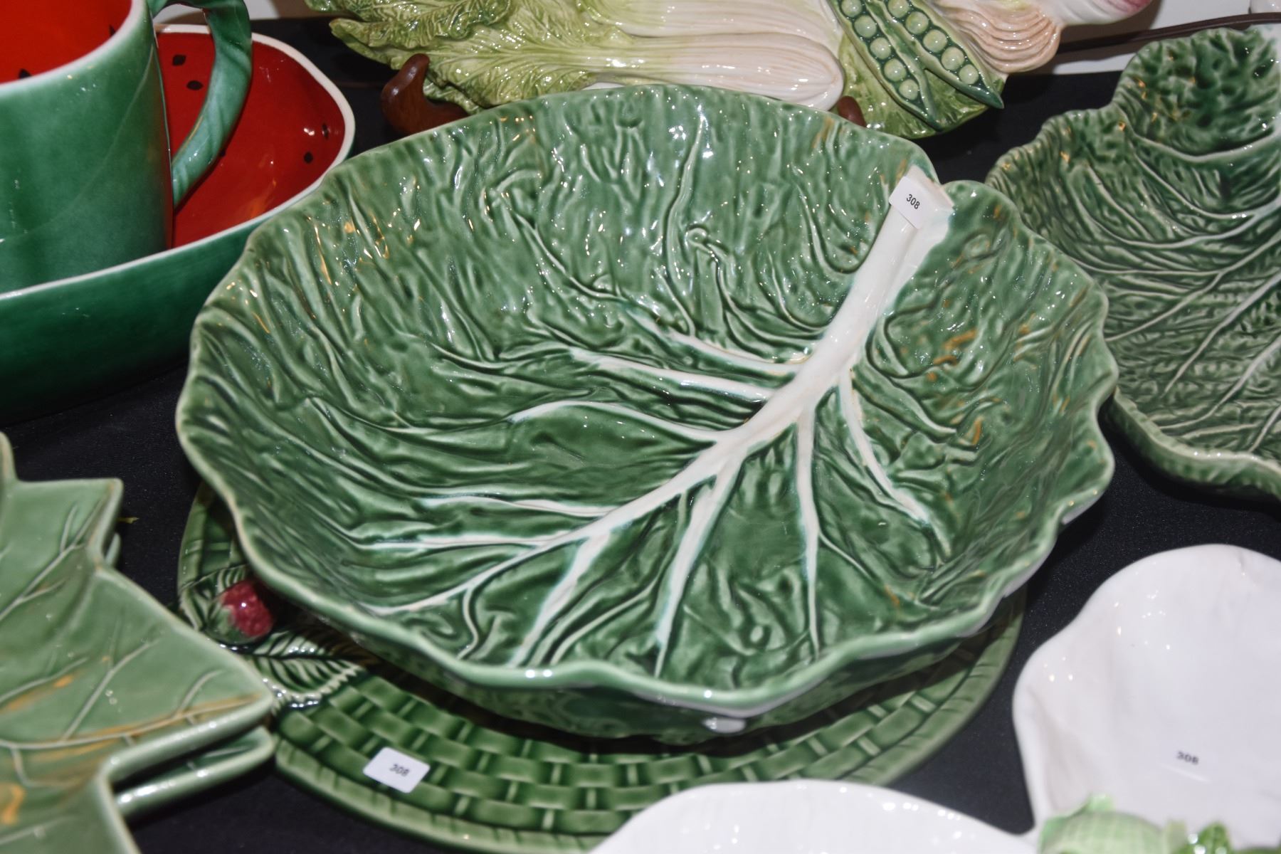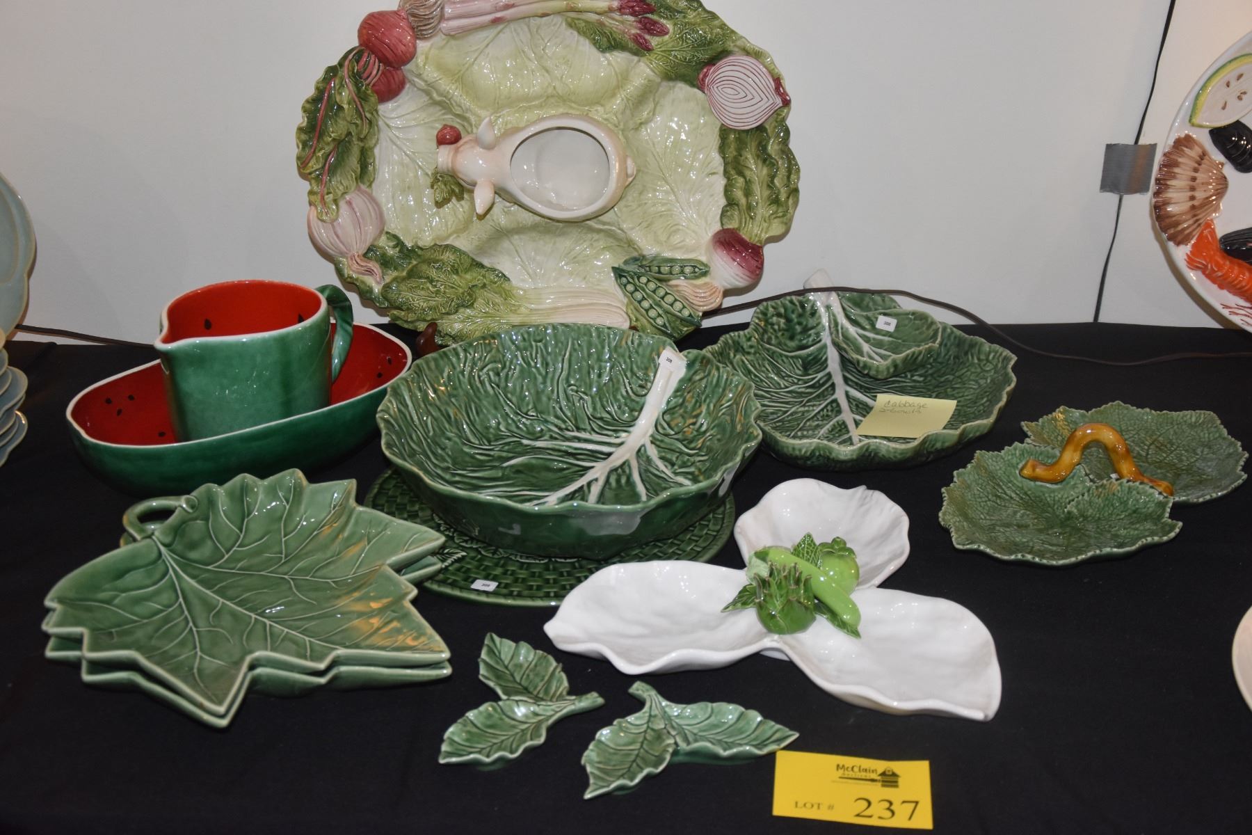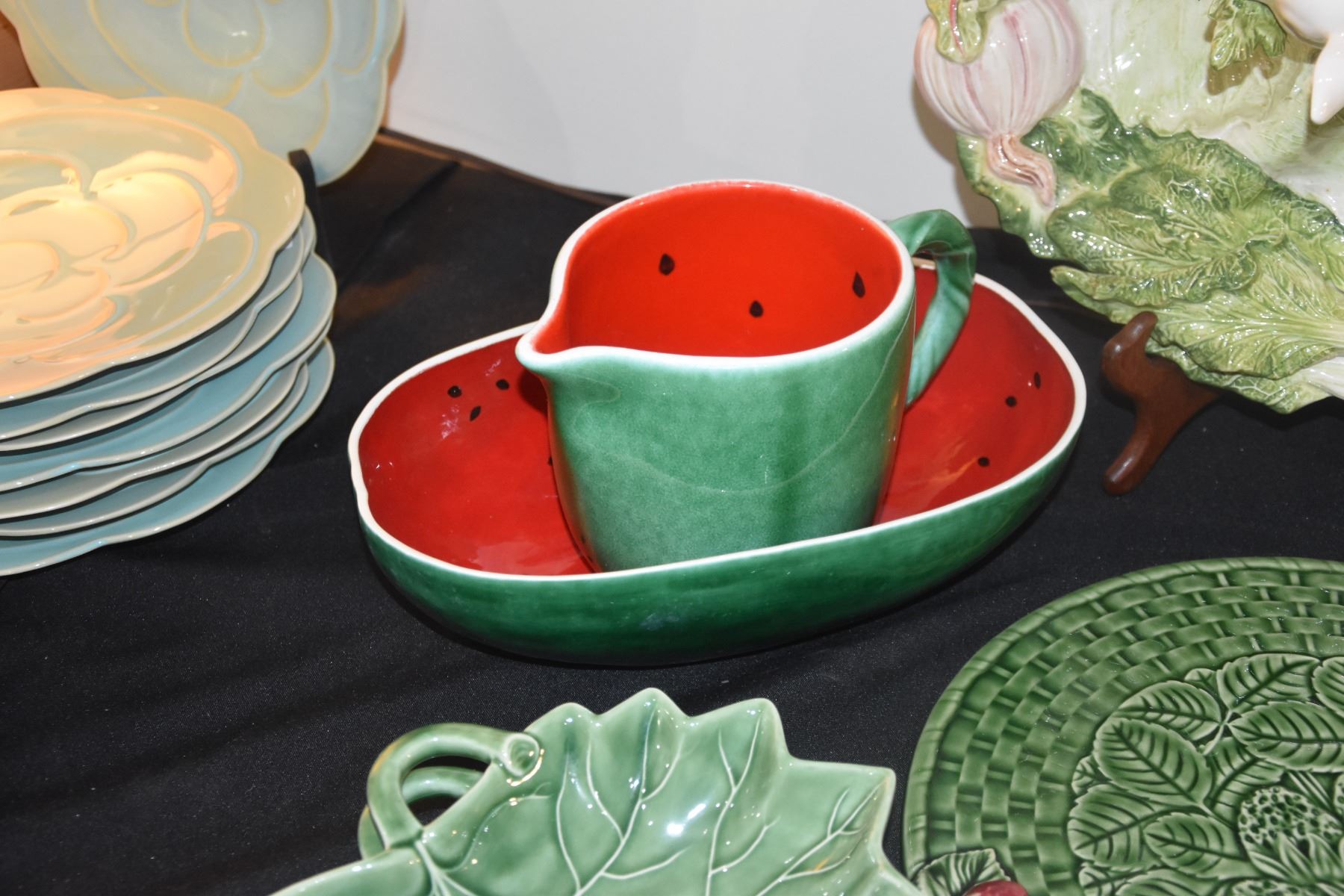FITZ & FLOYD FRENCH MARKET SERVING DISH, CABBAGE BOWLS, WATERMELON PITCHER & BOWL, LEAF BOWLS, ETC. (12 PCS)