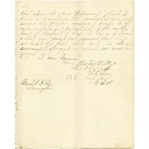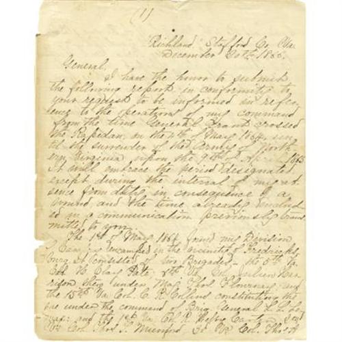 <B>FITZHUGH LEE: HIGHLY IMPORTANT POSTWAR MANUSCRIPT SENT TO ROBERT E. LEE.</B></I> Autograph Document Signed, “<I>Fitz Lee</B></I>”, 47 pages, 7.5” x 10”, “Richland”, Stafford County, Virginia, December 20, 1866, to Robert E. Lee, Lexington, Virginia. A small self-cover notebook of lined paper carries the following pencil inscription on its final page, “<I>Report of Cavalry operations by Fitz Lee</B></I>”. Written in letter form while the memories were still fresh, the younger Lee gives his superior (and uncle) a detailed account of the war’s final year from the perspective of a very senior cavalry commander. Opening with the Wilderness and Spotsylvania battles, Fitz Lee’s narrative recounts all of the bloody engagements that culminated in the Confederacy’s inevitable fall. Generals such as Stuart, Bragg, Hoke and Breckinridge are mentioned routinely. Long-forgotten junior officers such as Captain George Matthews “<I>who was killed in a very gallant charge</B></I>” are also briefly resurrected The letter/report opens as follows: “<I>I have the honor to submit the following report in conformity to your request to be informed in reference to the operations of my command from the time General Grant crossed the Rapidan, on the 4th of May 1864, until the surrender of the Army of Northern Virginia upon the 9th of April 1865”. </B></I>Many pages later, having had his say, Fitz Lee generously concludes with <I>“</B></I>…<I>upon the above testimonial which I know is insufficiently furnished you will award the proper measure of praise to the valor, endurance & patriotism of the noble band of troopers I had the honor to Comd. & that you must feel assured that they at least did their whole duty in the unsuccessful struggle in which we were engaged.” </B></I>This splendid account is a highly placed ex-Confederate’s early postwar attempt to analyze a bitterly unwelcome defeat. The report’s outer pages, serving as a cover wrap, have become disbound and are largely split along the spine. The remaining text is evenly toned and suffers only a few turned corners. <BR><BR><B>Condition:</B></I> Overall good, and a likely candidate for restoration.<BR><BR><b>Shipping:</b> Flat Material, Small (<a target="_blank" href="http://www.heritageauctions.com/common/shipping.php">view shipping information</a>)