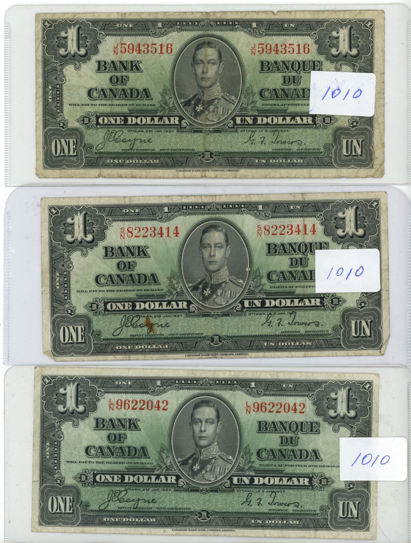 FIVE - 1937 - $1.00 Bank of Canada Notes - Signed by J.E.Coyne & G.F. Towers