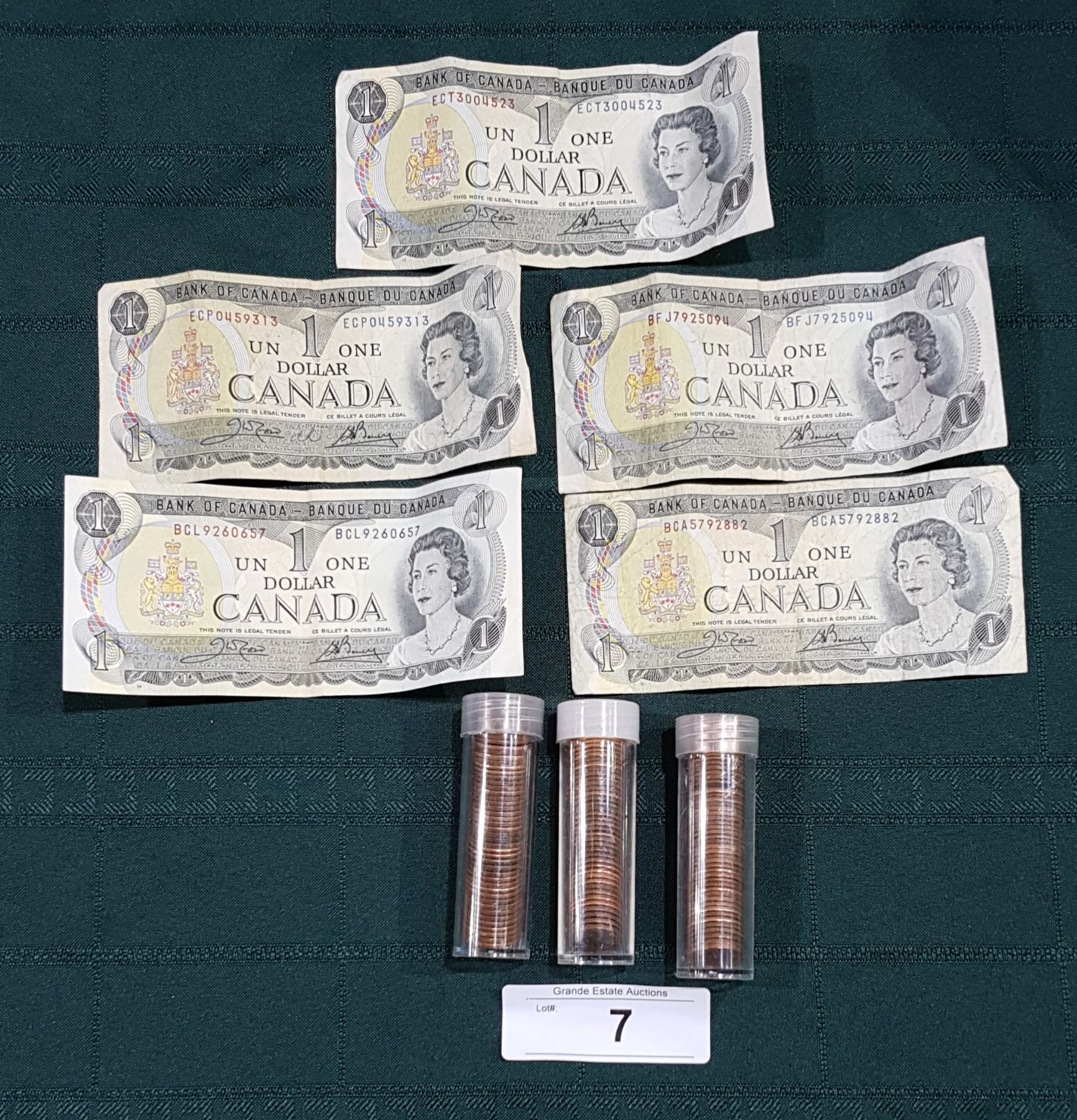 FIVE 1973 $1 BILLS & 3 TUBES OF CANADIAN PENNIES