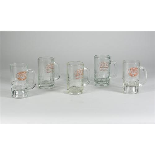 Five vintage clear glass Triple XXX root beer mugs, orange oval logo, ''Drink Triple XXX Root Beer'', 6''.
