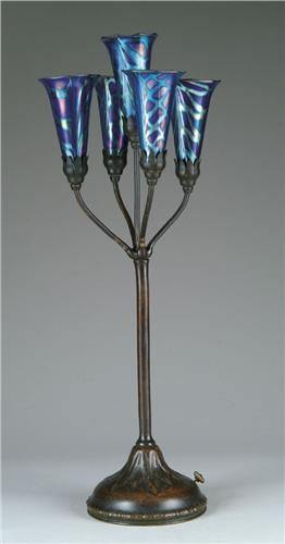 FIVE ARM LILY LAMP. Early Tiffany base has stylized leaf design at the bottom with riser supporting four outstretched arms encircling a center arm. All topped with decorated blue iridescent Lundberg shades. Each shade has a brilliant green/gold iridescent interior. Shades are signed "Lundberg 82" and base is marked "Tiffany Studios New York S1133" and a "6" underneath. SIZE: Overall height is 23 in. CONDITION: Wear to patina on base and sockets are replacements. Estate of Jon Heiden and Donald Mooers 5-60673