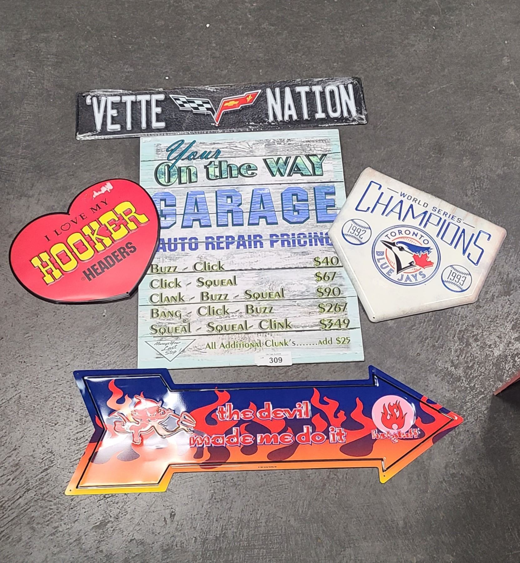 FIVE ASSORTED TIN SIGNS-REPRODUCTION