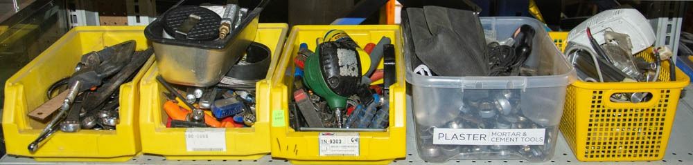 FIVE BINS OF ASSORTED HANDTOOLS AND HARDWARE