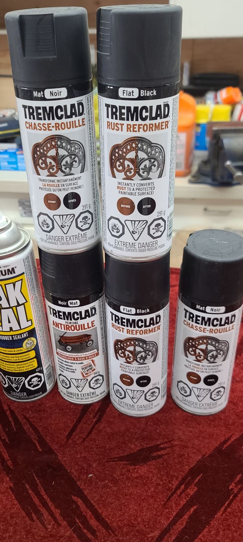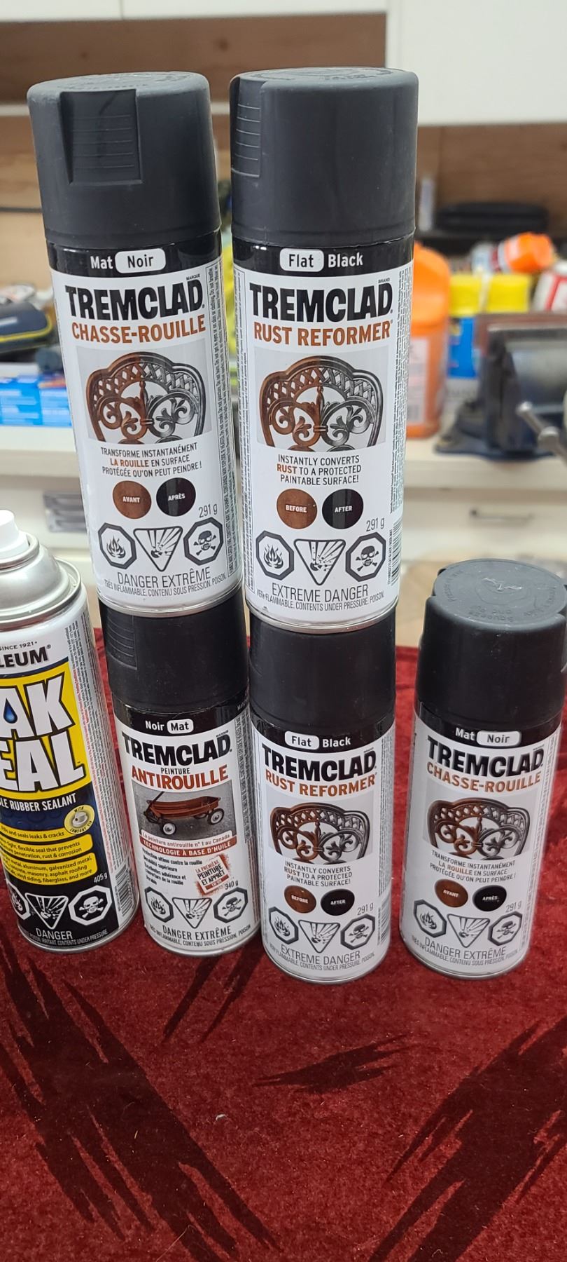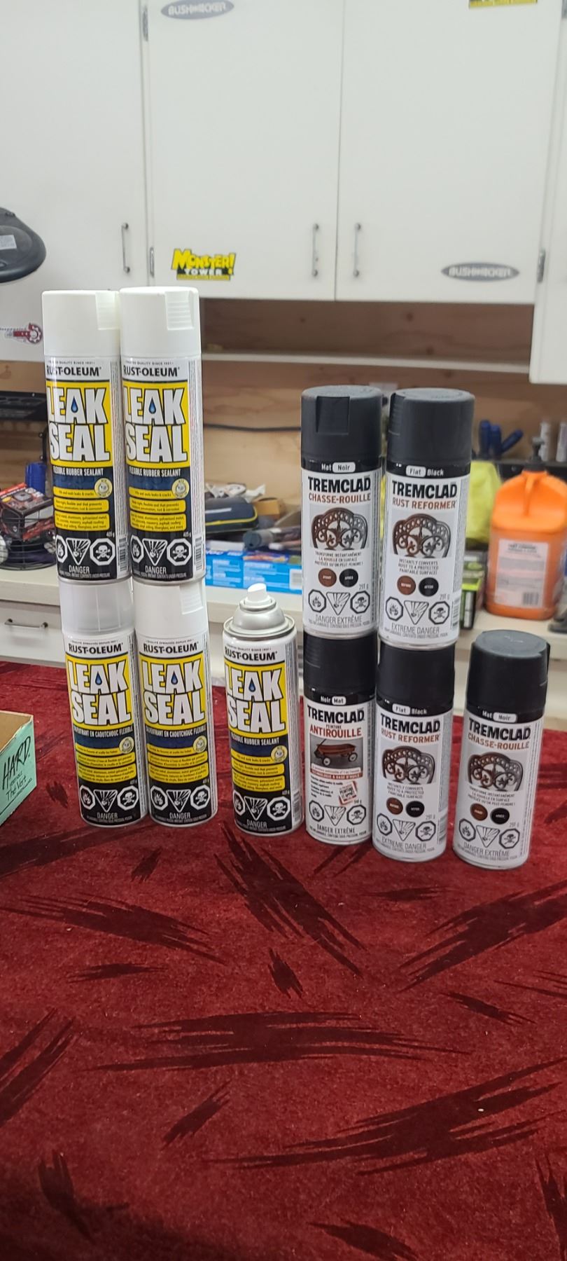 FIVE CANS OF SEAL LEAK AND FIVE CANS OF BLACK TRM CLA PAINT