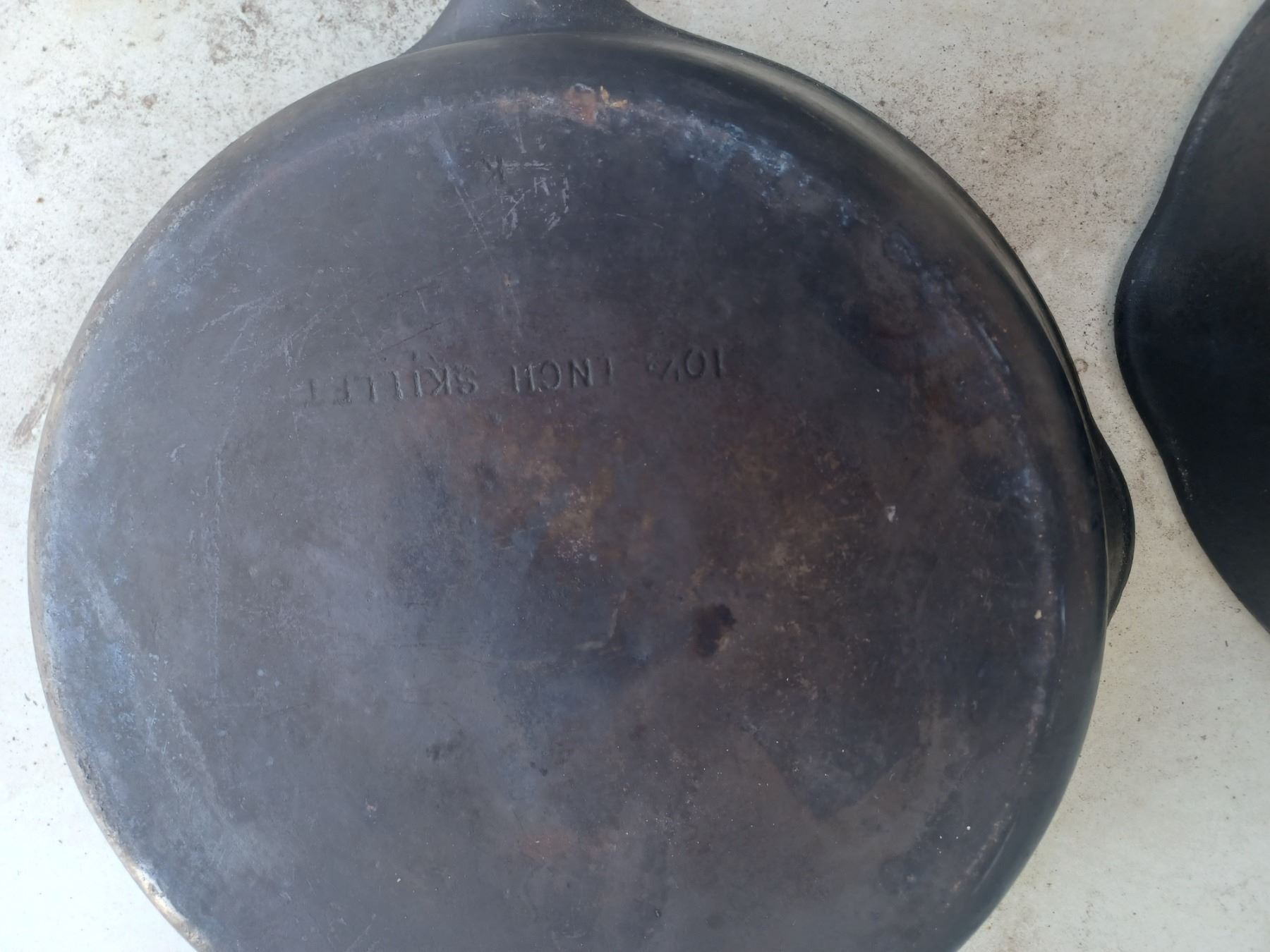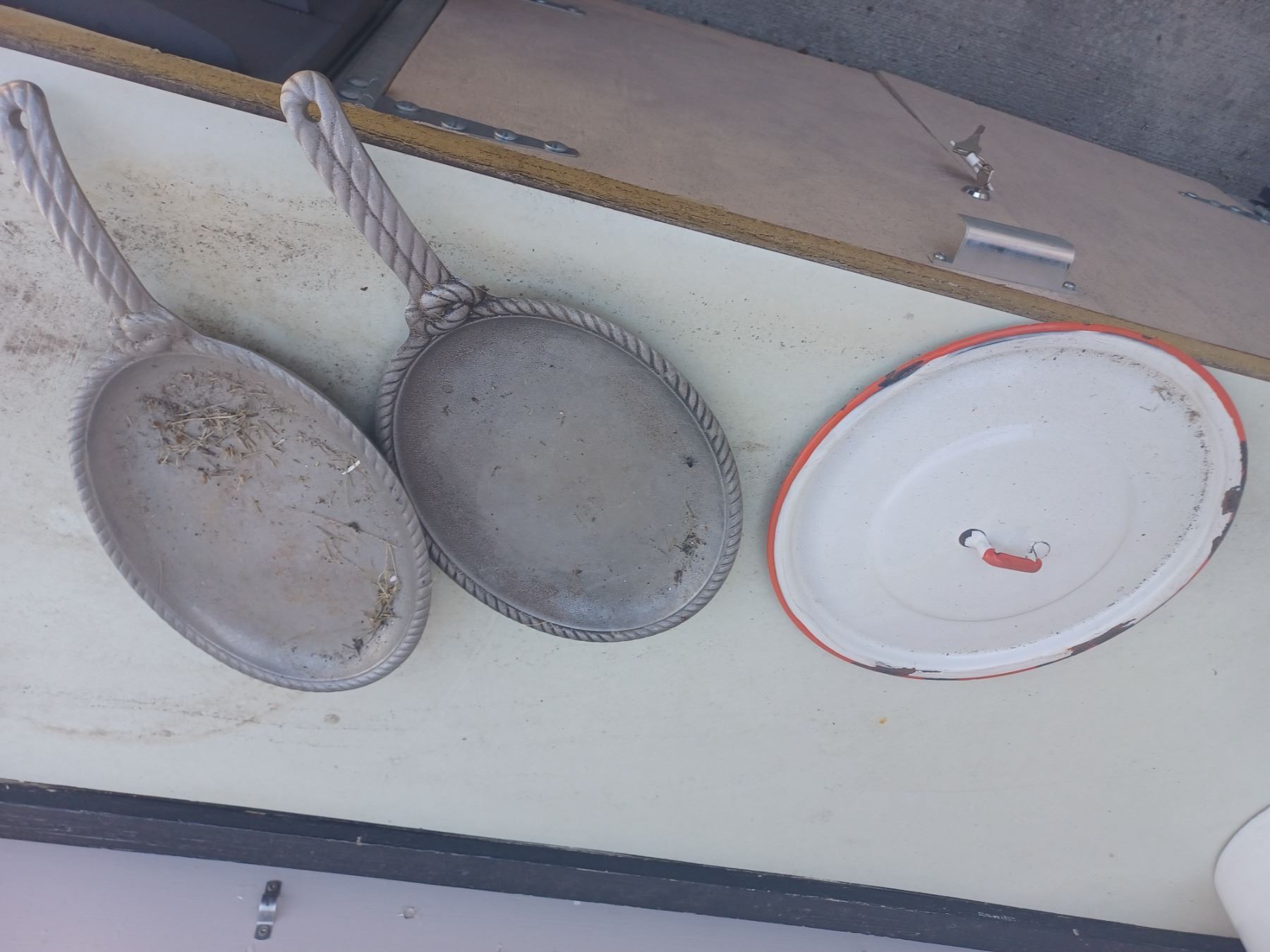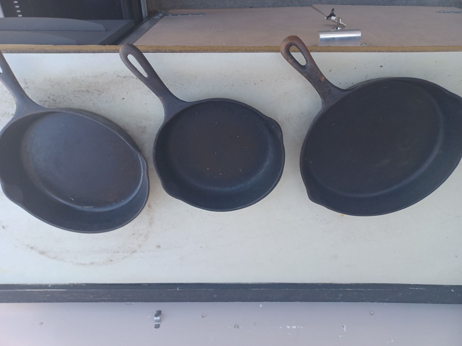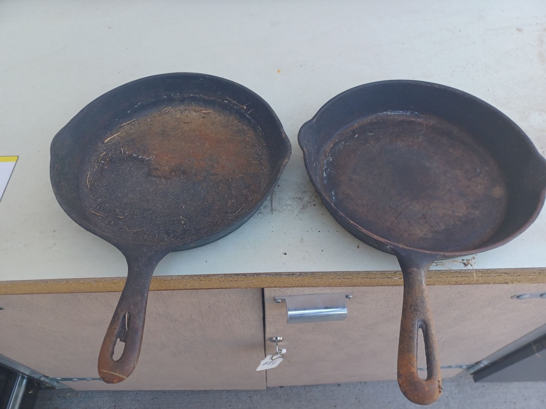 FIVE CAST IRON PANS, TWO CAST ALUMINIUM PANS,