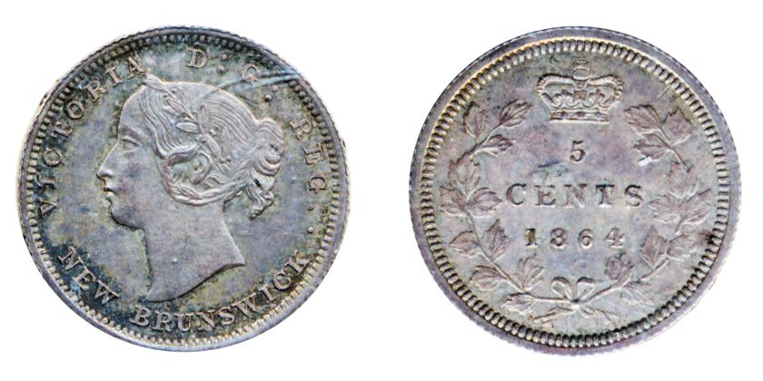 FIVE CENTS. 1864. Small ‘6’ variety. ICCS Mint State-64. Pleasing gray-purple toning, evenly distributed on both sides. Fully struck and tied for the ‘Finest’ graded example by ICCS.
