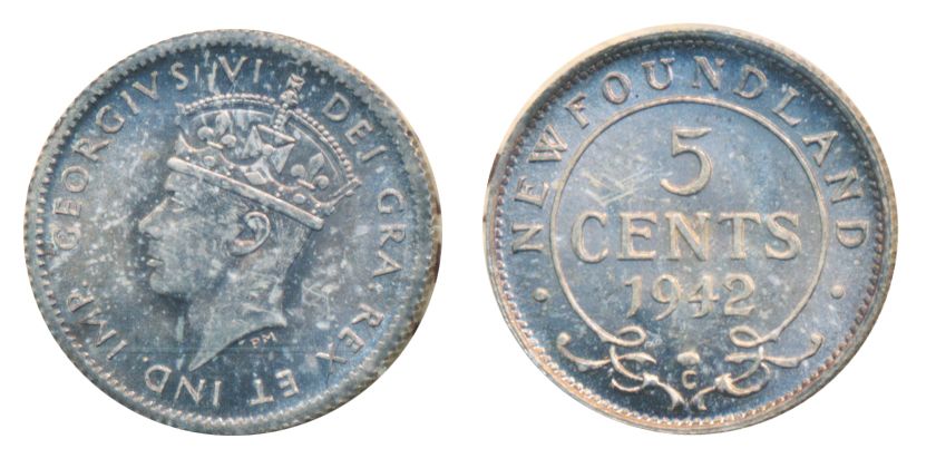 FIVE CENTS. 1942-C. ICCS Mint State-64. Medium heavy rainbow hues, predominated by light purple shades.