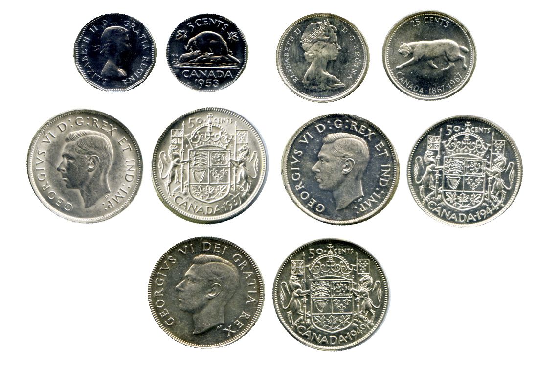 FIVE CENTS. 1953. NSF. FL. ICCS Mint State-64; 25 CENTS. 1967. ‘Rotated Dies’. Believed to scarce or rare. FIFTY CENTS. 1937. ICCS Mint State-60. 1944. Far 4. ‘Cameo’. ICCS Mint State-60; 1949. ICCS Mint State-62. Lot of five (5) coins.