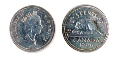 FIVE CENTS. Canada. 1996. A misaligned die error. The reverse is centered, the obverse is off-center 5%.