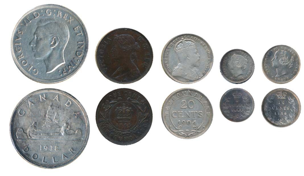 1885. Large re-punched 5. ICCS Very Fine-30; 1874-H. ICCS Extra Fine-40; $1.00. 1938. ICCS EF-40; Nfld. One Cent. 1865. ICCS EF-40; Nfld. 20 Cents. 1904-H. ICCS VF-20. Lot of five (5) coins.