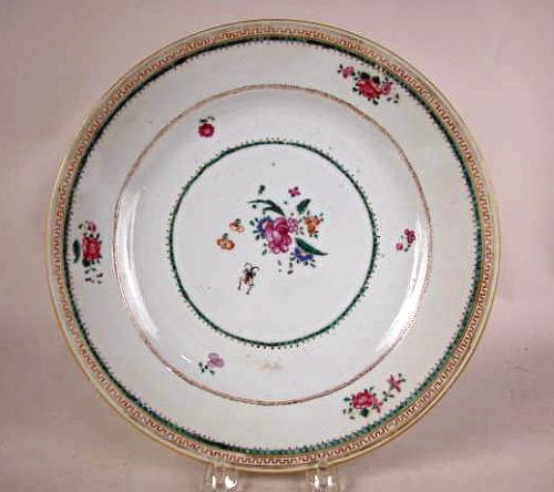 FIVE CHINESE EXPORT PLATES; Greek key decorated border, (losses) 10"diameter
