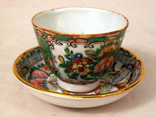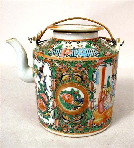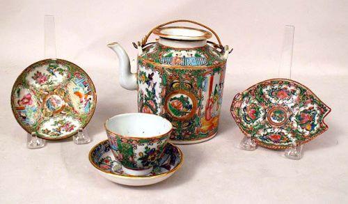 Comprising a teapot, a tea cup, and three small dishes. Losses.