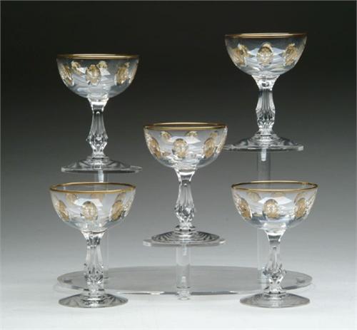 FIVE CUT GLASS CHAMPAGNES. Wonderful set of five champagnes with each having eight concave panels with gold enameled decoration, lapidary cut stem. Four of the five stems are signed with an acid etched "T" in a shield. SIZE: 5 in. t. CONDITION: One champagne has roughage to the knob on the stem, otherwise very good to excellent. Estate of Edwin Schiebel Sr. 5-60199