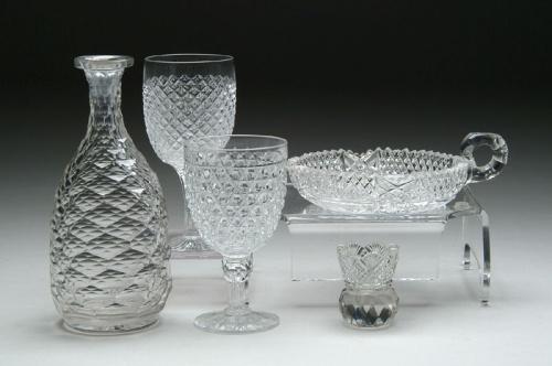 FIVE CUT GLASS ITEMS. 1) Toothpick holder in diamond point and fan pattern. SIZE: 2-1/2 in. t. CONDITION: Minor chips to side. 2) Nappy with strawberry diamond and floral pattern. SIZE: 7-1/2 in. l. CONDITION: Various chips to rim. 3) Bottle cut in hollow diamond pattern. SIZE: 8-1/2 in. t. CONDITION: Minor roughness to rim. 4) Water goblet in strawberry diamond pattern. SIZE: 6-1/2 in. t. CONDITION: Very good to excellent. 5) Water goblet cut in hobnail pattern. SIZE: 5-3/4 in. t. CONDITION: Very good to excellent. Estate of Edwin Schiebel Sr. 5-60142