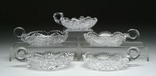 FIVE CUT GLASS NAPPIES. Lot consists of five cut glass nappies, three are cut in hobstar pattern with one signed w/"Libbey" acid etched, the remaining two are cut in hobstar and cane pattern with crosshatching. SIZE: Four are 7-1/4 in. w and the other is 6-1/4 in. w. CONDITION: Minor edge roughness to three, otherwise very good to excellent. Estate of Edwin Schiebel Sr. 5-60096, 5-60113