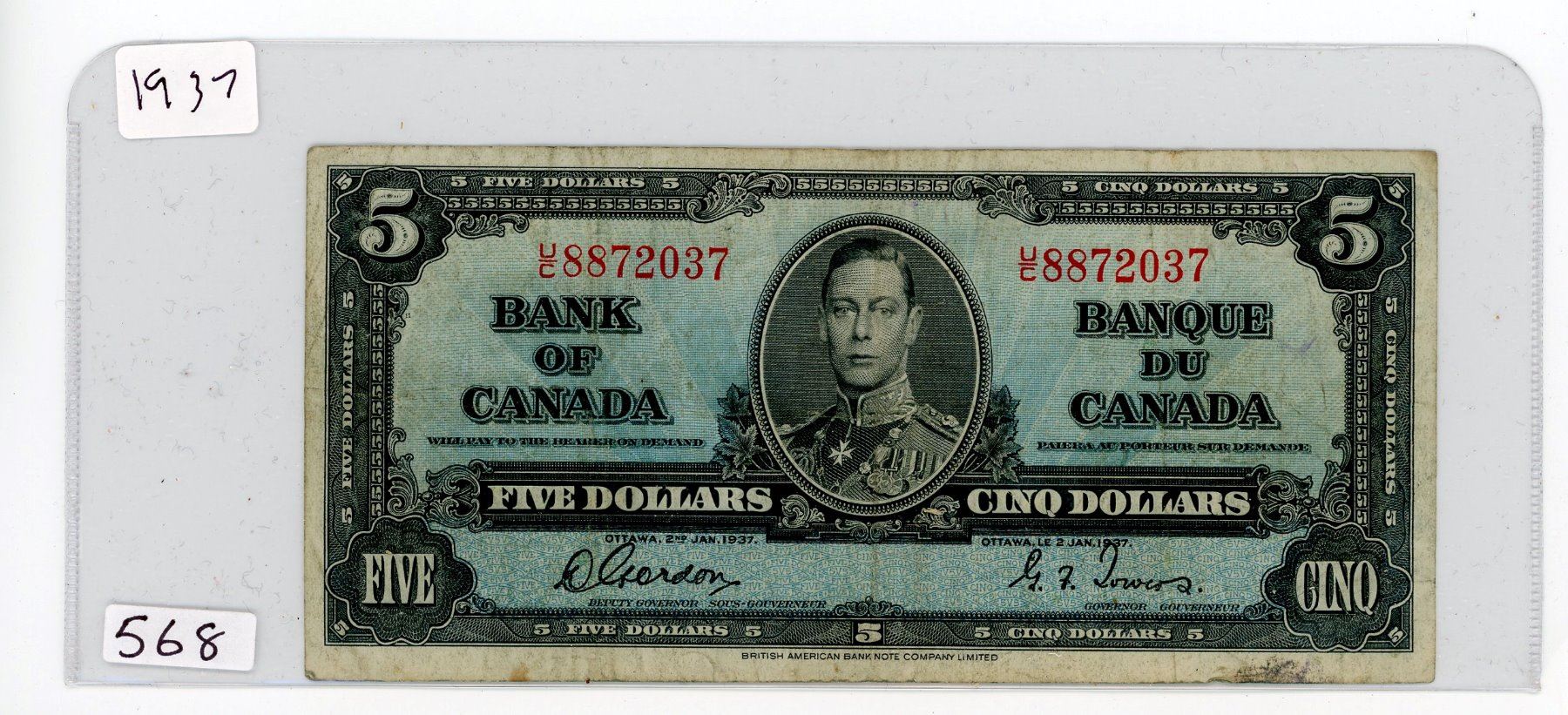 FIVE DOLLAR BILL (BANK OF CANADA) *1937*