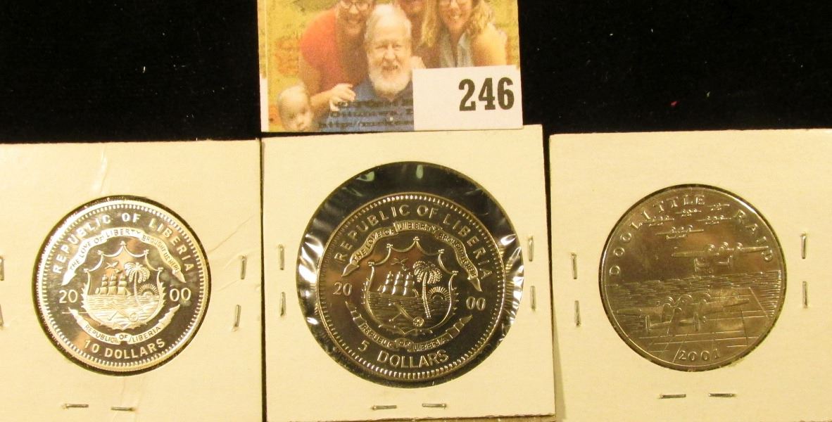 FIVE DOLLARS COINS FROM LIBERIA INCLUDING ONE COMMEMORATING THE DOOLITTLE RAID AND STAUTE OF LIBERTY PLUS $10 SILVER COIN COMMEMORATING THE CROSSING OF THE DELEWARE RIVER