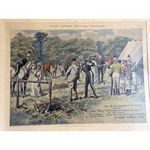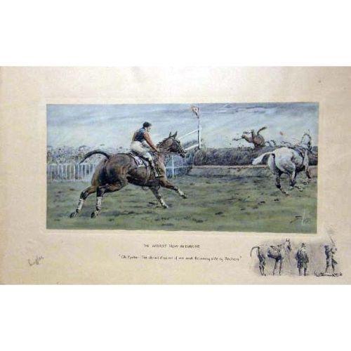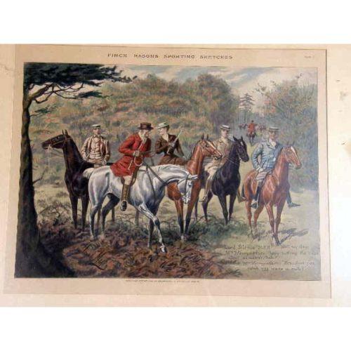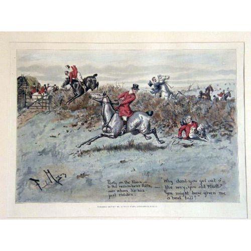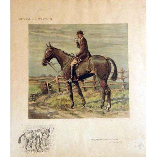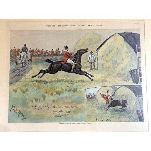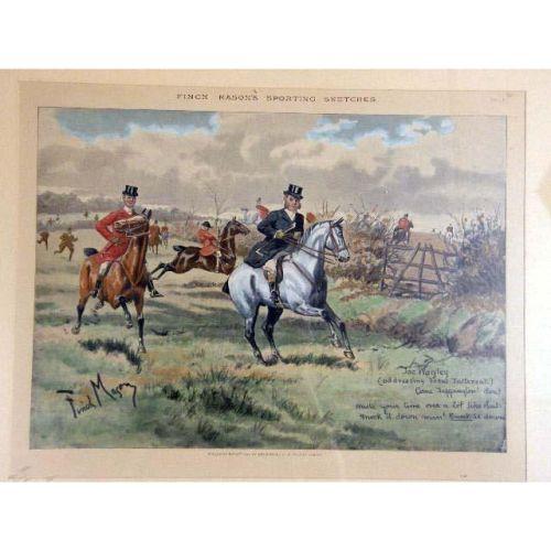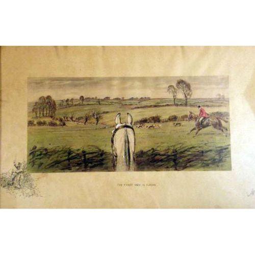 FIVE FRAMED POLYCHROME PRINTS<BR><BR>Depicting "Find Mason Sporting Sketches," England. Together with three similar framed prints, titled "The Gent in Ratcatcher," "The Worst View in Europe," and "The Finest View in Europe," all bear signature Geoffrey, 10"h x 14"w, stains, foxing, 8 pieces