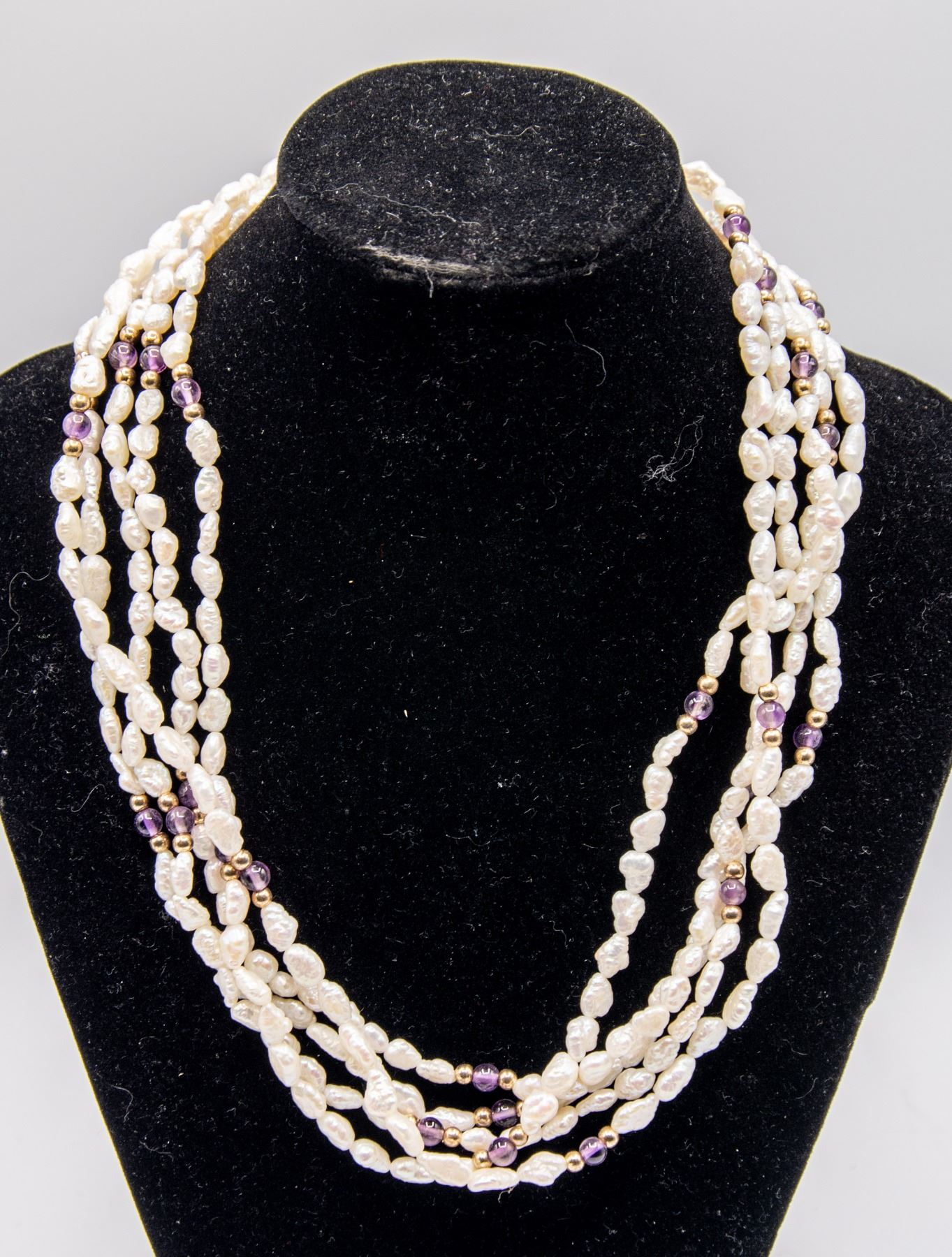 FIVE FRESHWATER PEARL AND AMETHYST NECKLACES