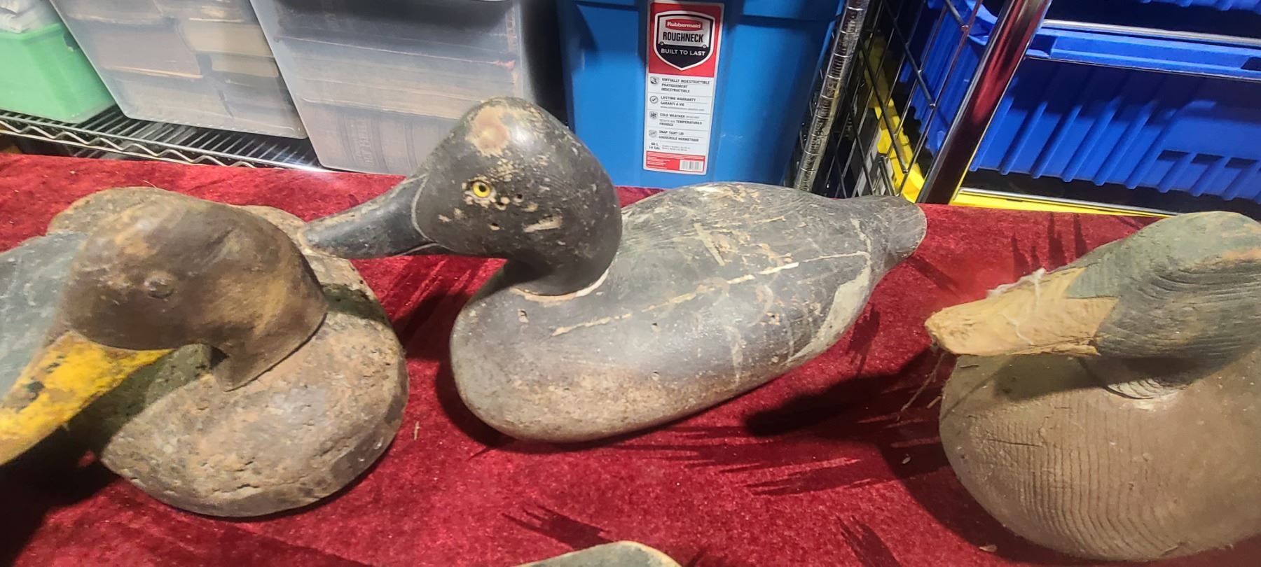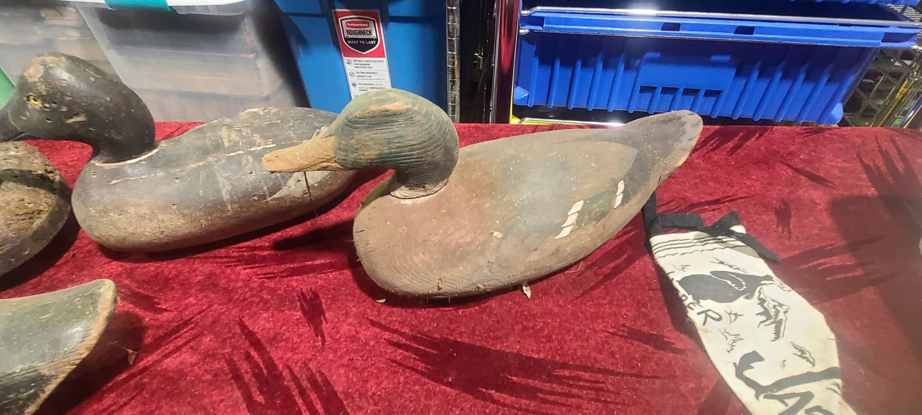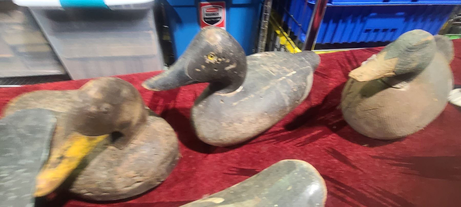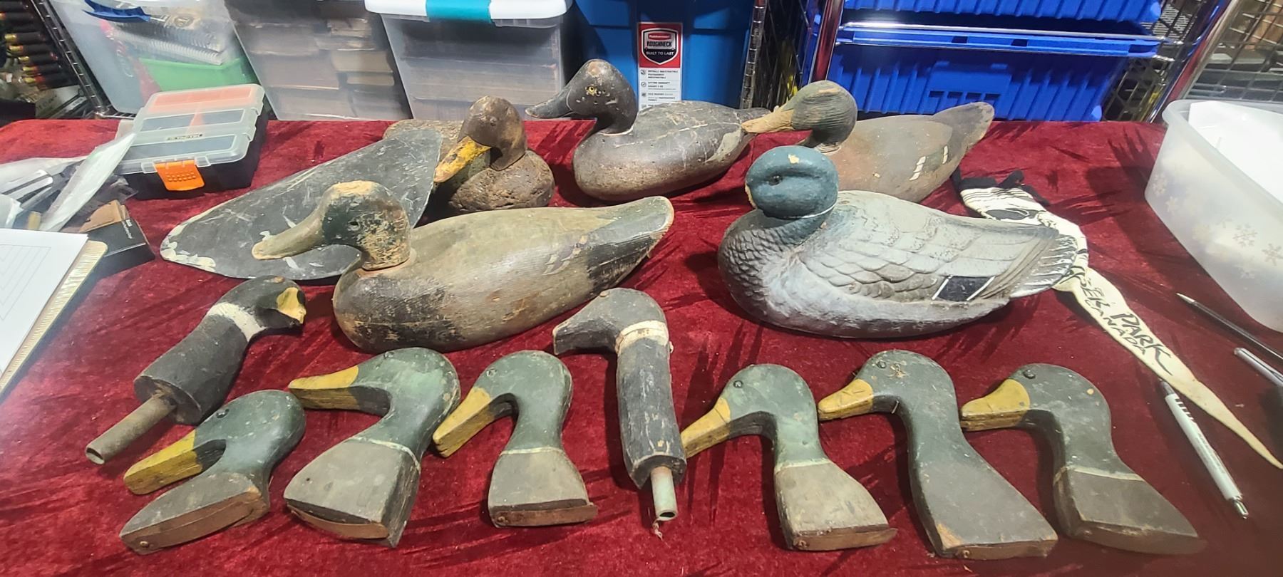 FIVE FULL ANTIQUE DECOYS AND MISC. DECOY HEADS COMES WITH TOTE