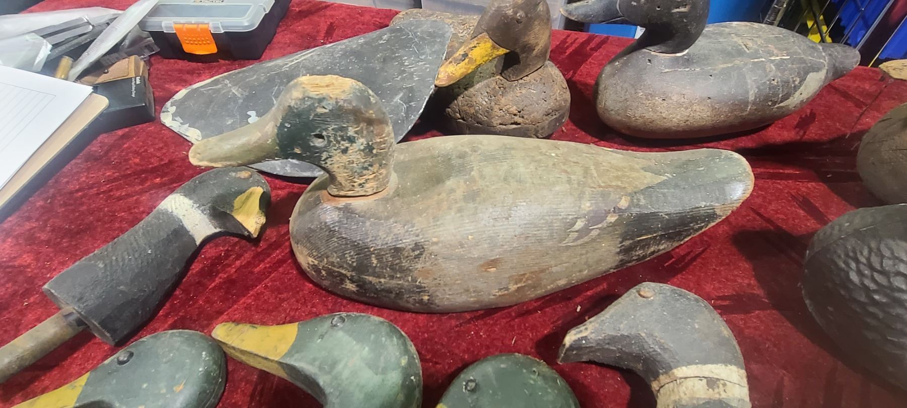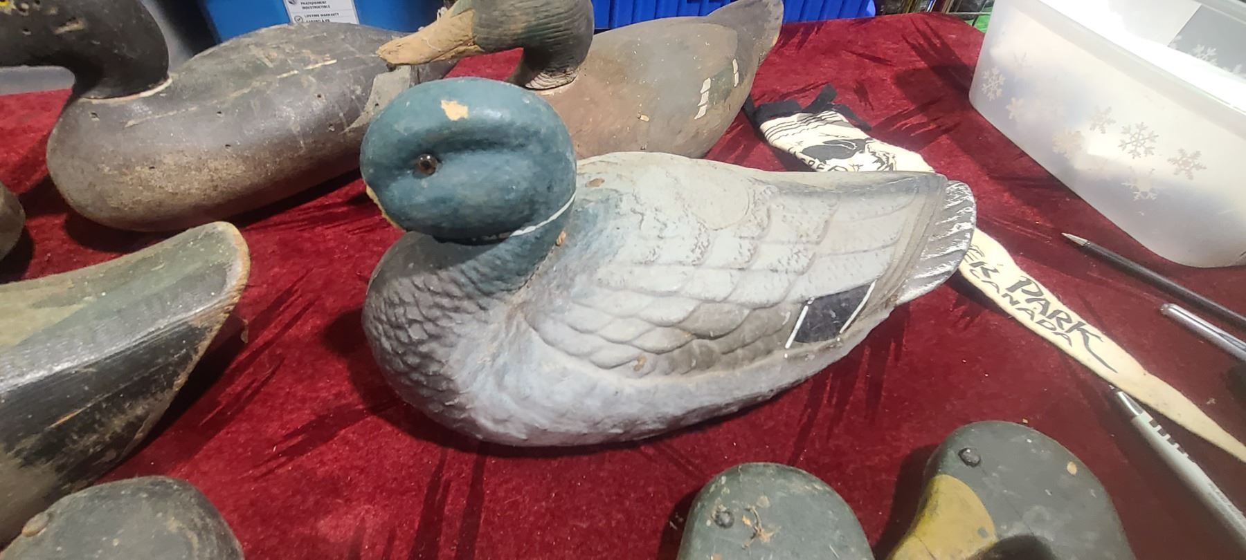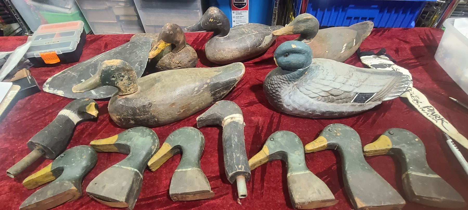 FIVE FULL ANTIQUE DECOYS AND MISC. DECOY HEADS COMES WITH TOTE