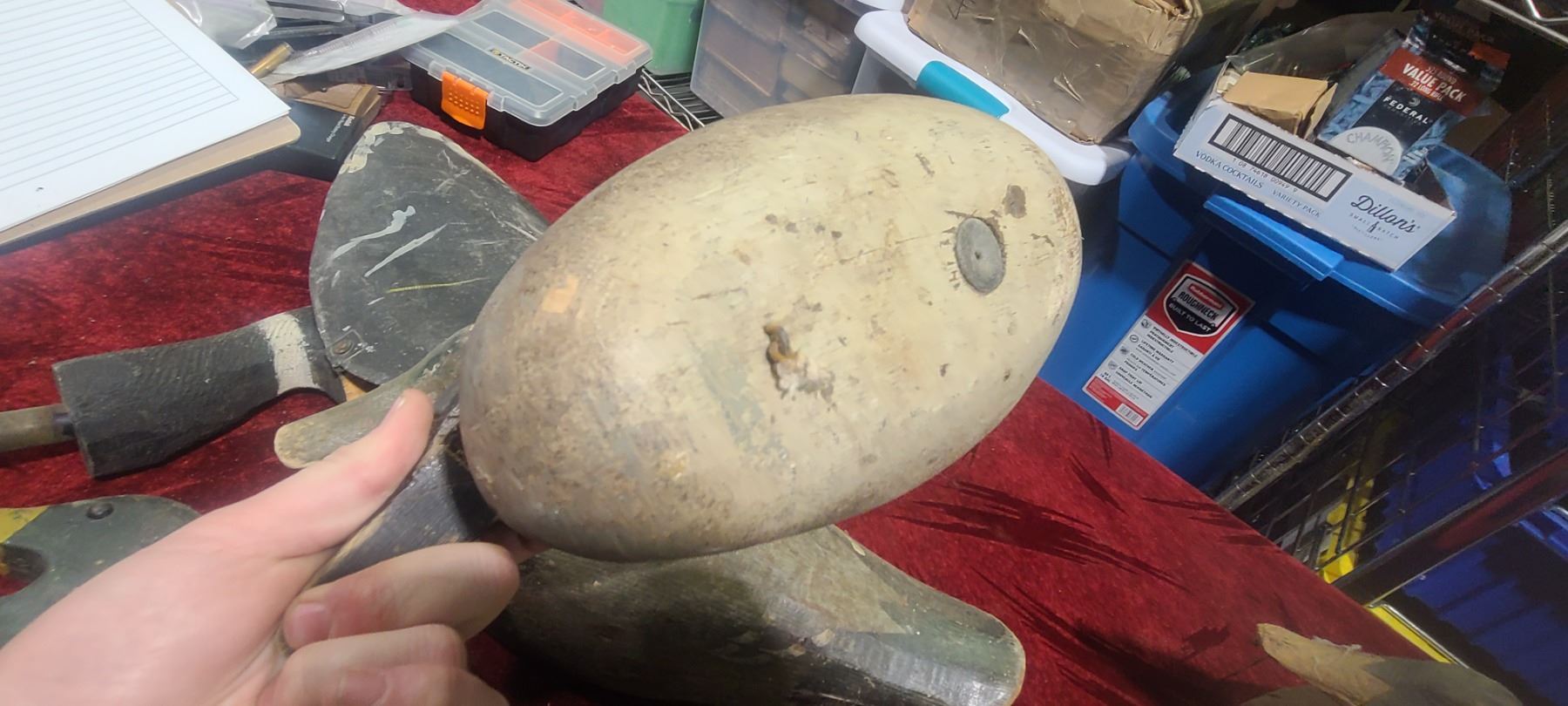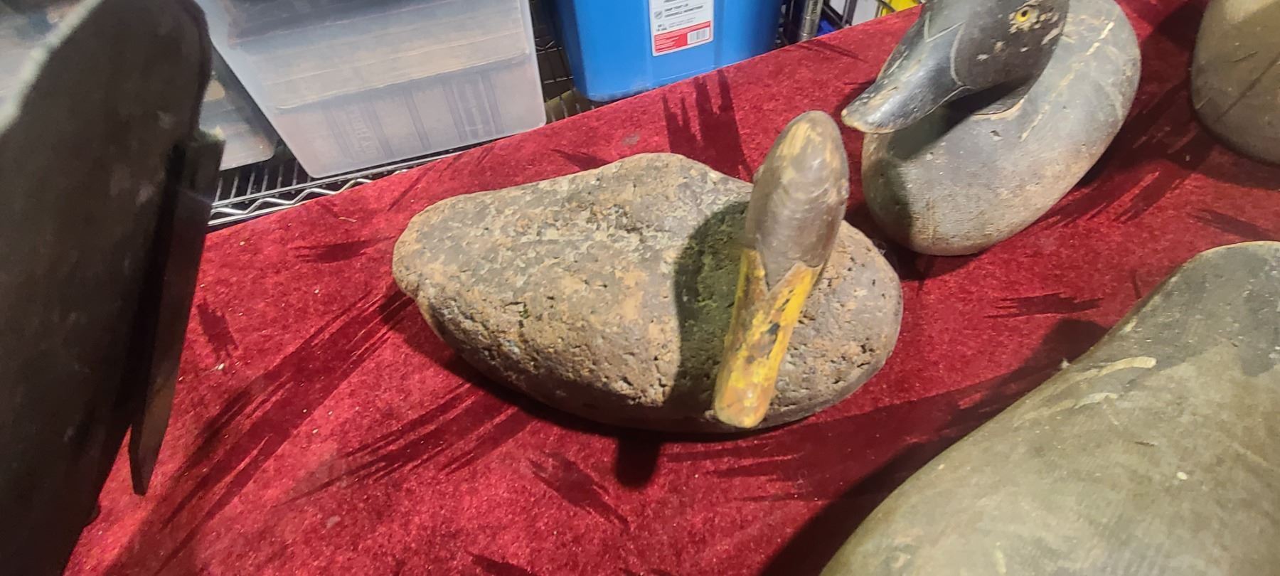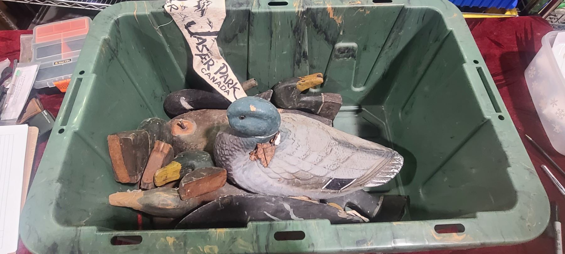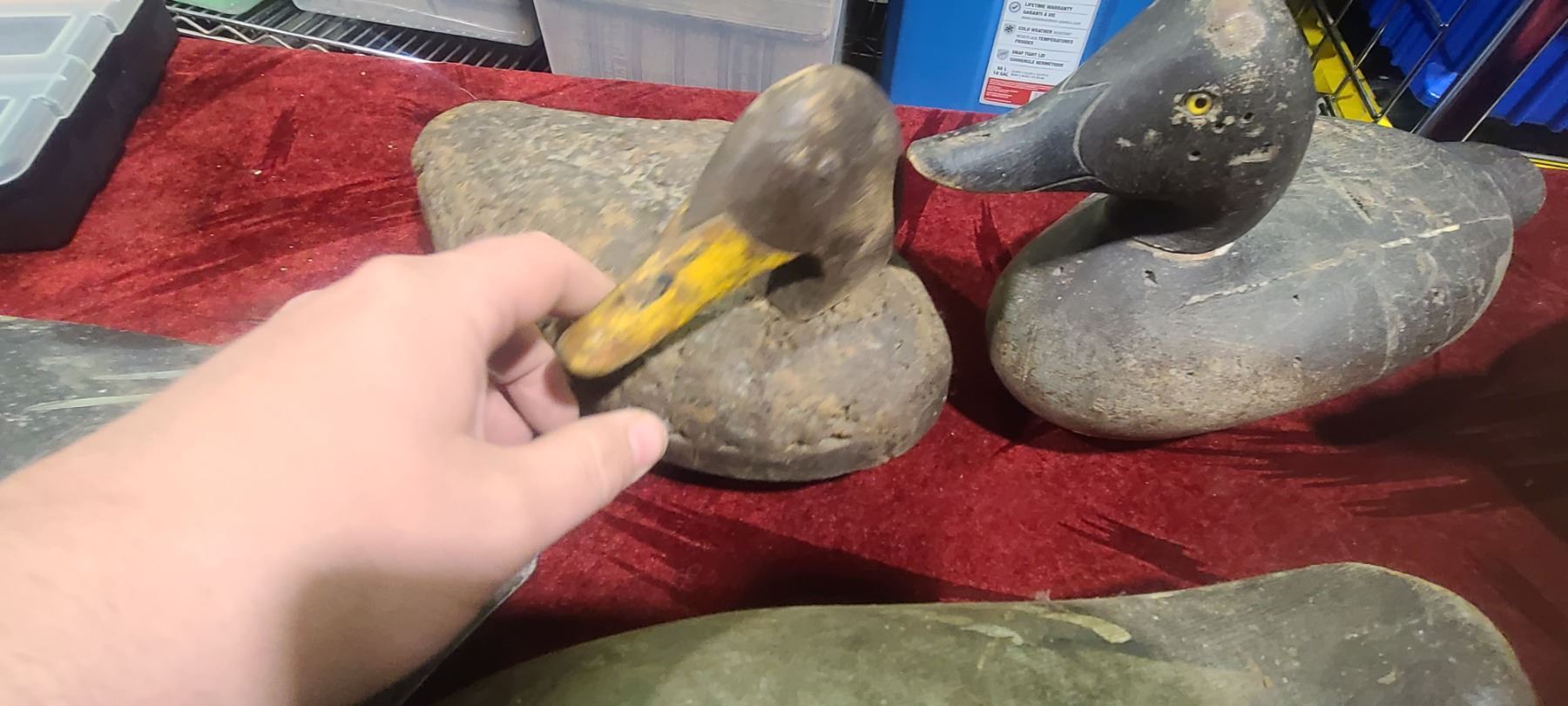 FIVE FULL ANTIQUE DECOYS AND MISC. DECOY HEADS COMES WITH TOTE