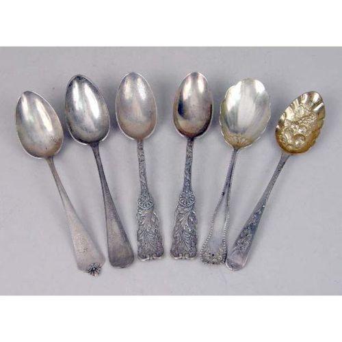 FIVE GORHAM STERLING SILVER TABLESPOONS<BR><BR>Comprising a pair of "St. Cloud" (1885) pattern, a "Lancaster" (1897), a "Gorham" (1880), and a "Fleur-de-lis" (1865), together with a berry-chased vermeil bowl spoon, total weight apx. 14 T.O.
