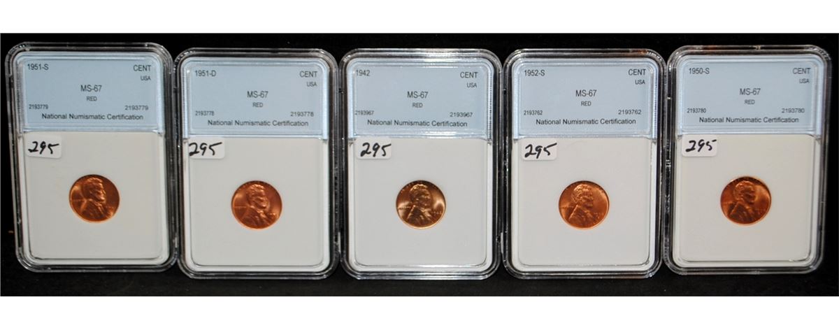 FIVE GRADED NNC MS67 RED LINCOLN CENTS - 1942, 1950-S, 1951-D, 1951-S, 1952-S - SOLD PER COIN TIMES 5