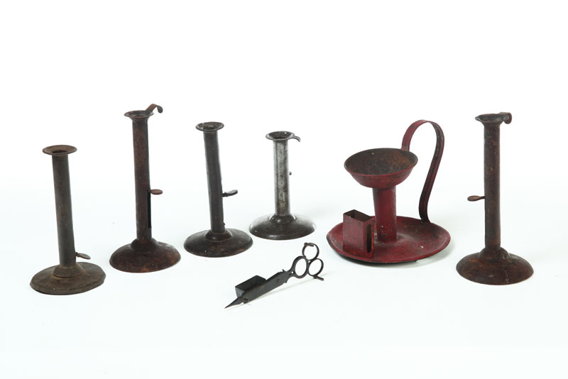 American and English, 1st half-19th century, iron. Pair of sticks with push-ups and lip hangers, 8 1/2"h., two with push ups marked "Shaw" and a single unmarked, 6", 7", 7"h. Together with a scissor wick trimmers, 6 1/2"l., and a red tole chamberstick with matchbox holder. Repainted. 6 1/2"h.