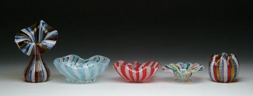 FIVE ITALIAN ART GLASS ITEMS. Lot consists of three latticinio and ribbon bowls, a latticinio and ribbon jack in the pulpit vase and a rose bowl. Rose bowl is pictured in the "Collectible Glass Rose Bowls" by Johanna Billings fig. 519 pg. 161. Accompanying lot is an autographed copy of "Collectible Glass Rose Bowls" by Johanna Billings with Sean Billings. CONDITION: Very good to excellent. Collection of Johanna and Sean Billings 5-60983