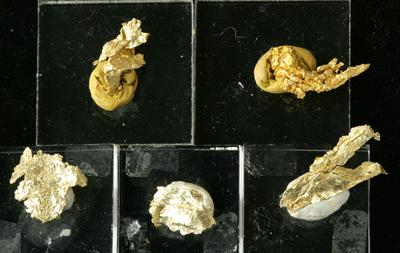 FIVE LEAF AND CRYSTALLINE GOLD SPECIMENS. These pieces are mounted on clear lucite stands. Three of them are from Jamestown, California, and two are from the Round Mountain Mine. It is very unusual to get nice gold leafs.