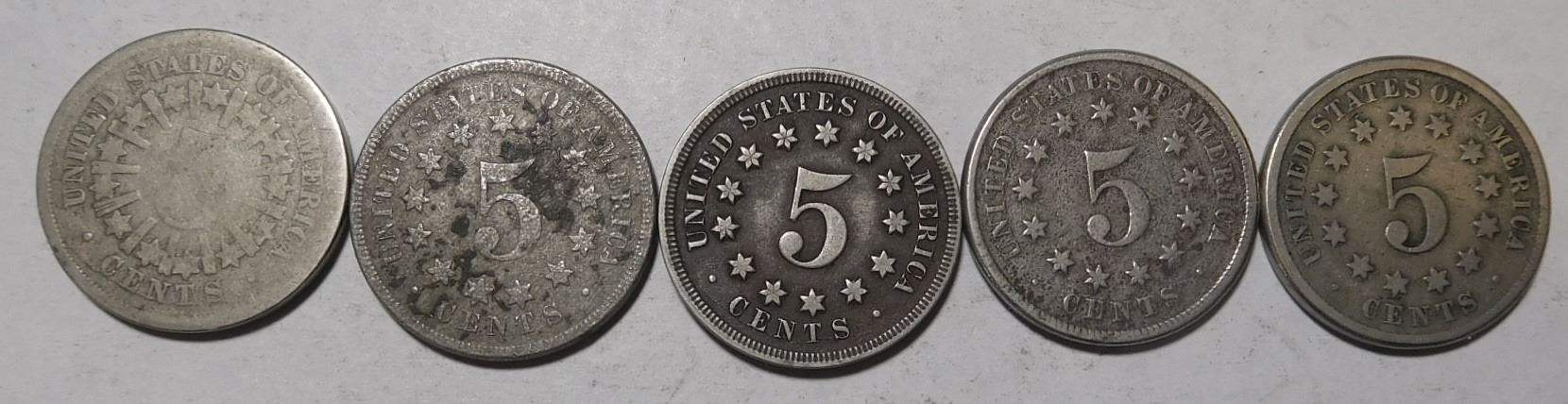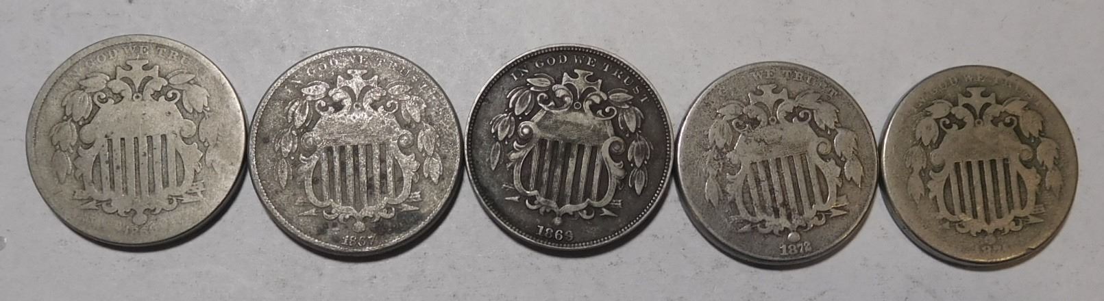 FIVE MISC. DATE SHIELD NICKELS AVE. CIRC. (5 COINS)