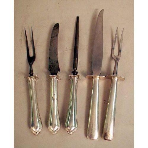 FIVE MISCELLANEOUS STERLING SILVER FLATWARE SERVING PIECES<BR><BR>Including a cold meat fork, a shell-form bowl serving spoon, a pair of scissors, a cake server, and a condiment fork, together with eight flat-handled butter spreaders, two carving sets and fruit knives, longest 9-1/2"l, total weight apx. 13 T.O. weighable