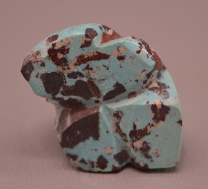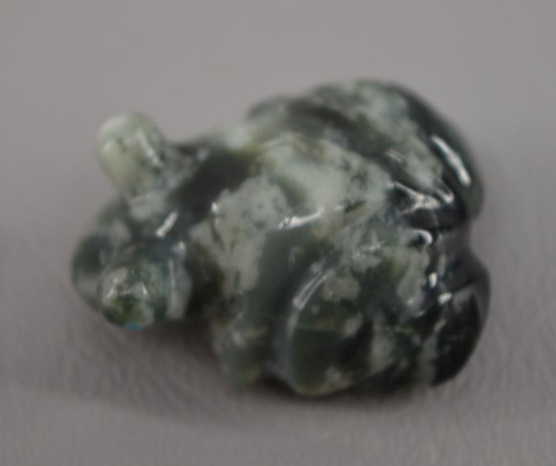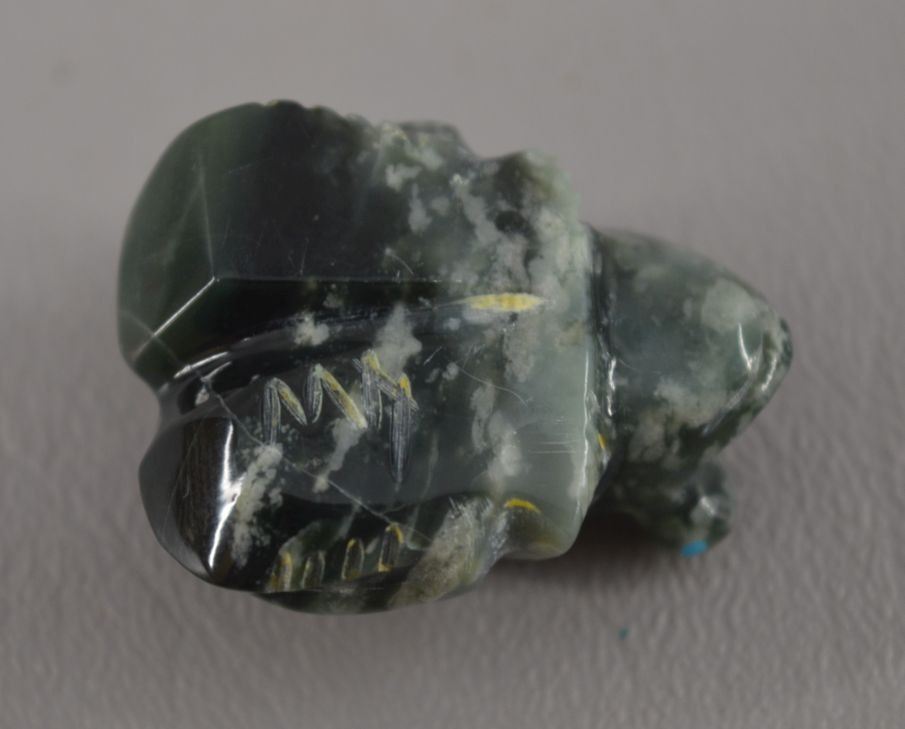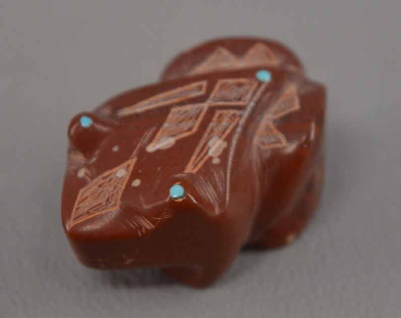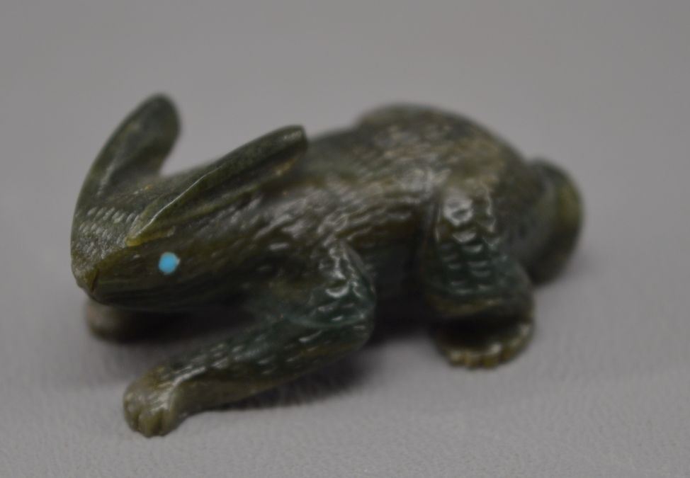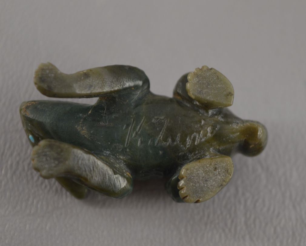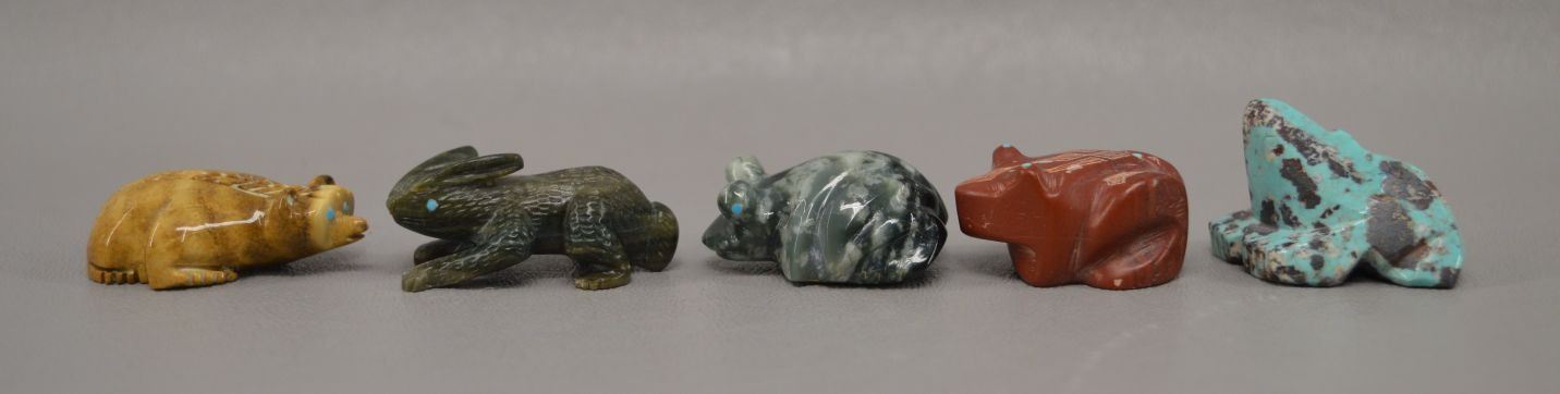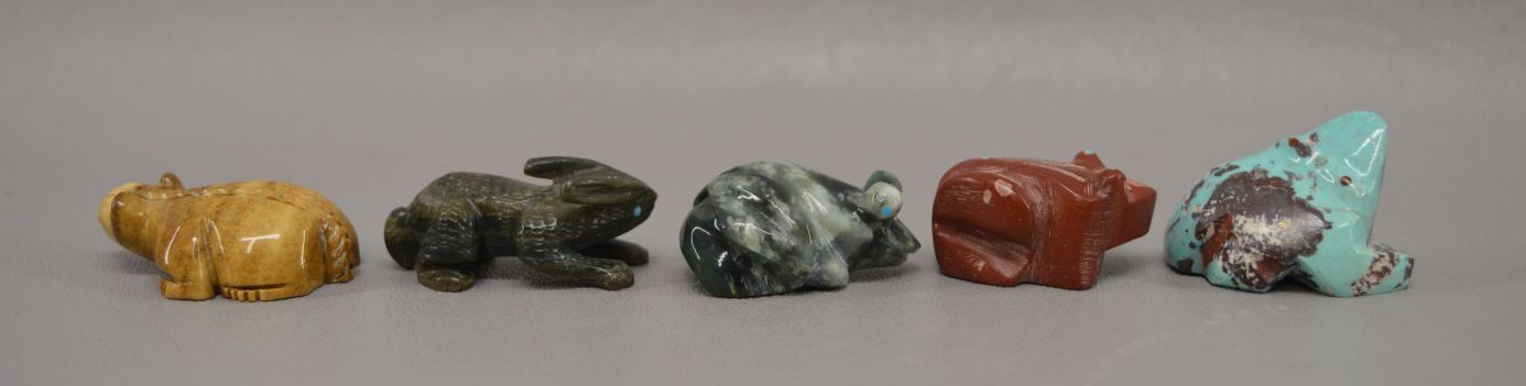 contemporary zuni indian carved, Jadeiti rabbit by Karen Zunie, .75" x 1.5", pipestone frog by Brandon Phillips .75" x 1.25" fishrock badger by ephran chavez 1" x 1.5", turqouise frog by carlton Laiwekete 1" x .75", serpentine frog by Fred Weekoty