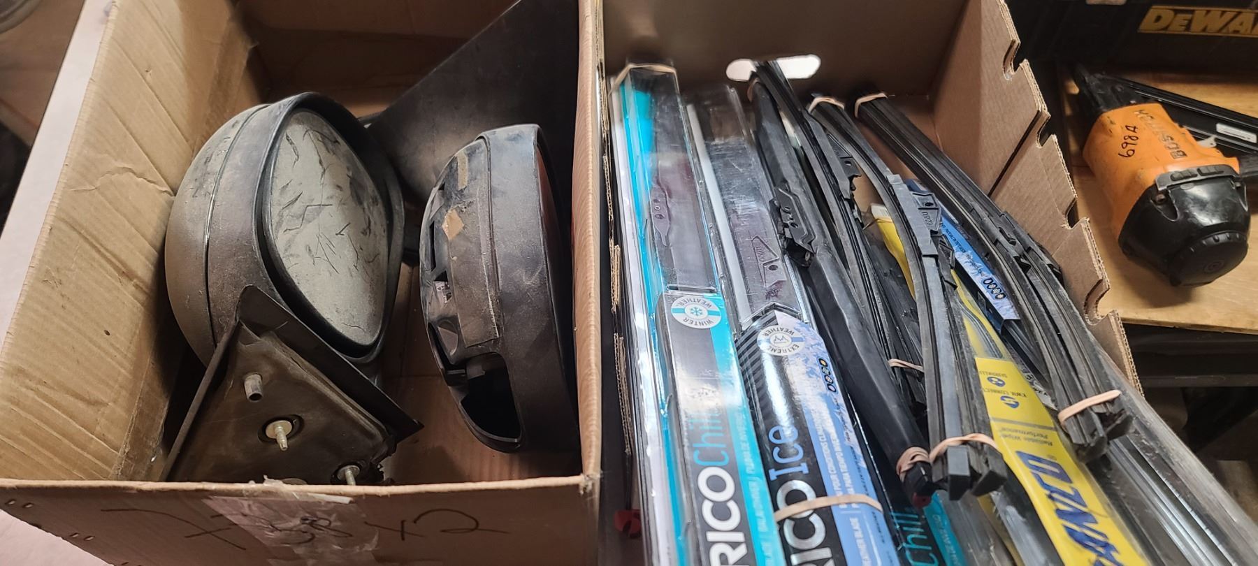FIVE NEW 20-22" AND EIGHT USED BUT GOOD WINDSHIELD WIPER BLADES AND TWO MIRRORS