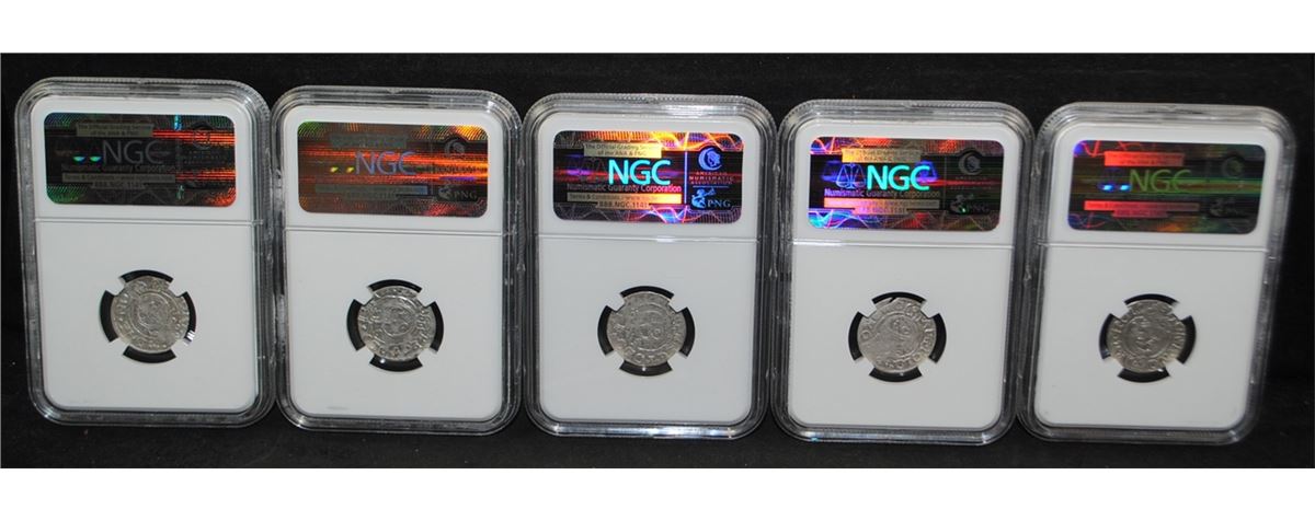 FIVE NGC GRADED FOREIGN COINS - 1620 POLAND 3P GUM-970 NGC VF25, 1621 POLAND 3P GUM-971 - NGC F15, 1624 POLAND 3P GUM-974 NGC VF25, 1624 POLAND 3P GUM-974 NGC VF20, 1625 POLAND 3P GUM-975 NGC VF30 - SOLD PER COIN TIMES 5