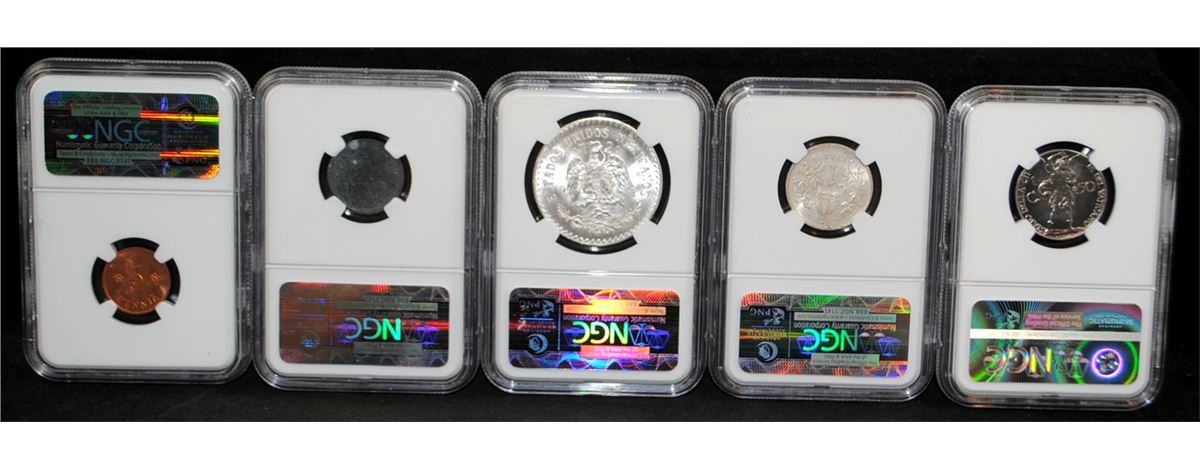 FIVE NGC GRADED FOREIGN COINS - 1940 II VATICAN 50 CENT - MS67, 1933M MEXICO PESO - MS64, 1913 AUSTRIA CORONA - MS63, 1938 FINLAND 5P MS62 RD, 1945 YUGOSLAVIA DINAR - MS62 - SOLD PER COIN TIMES 5