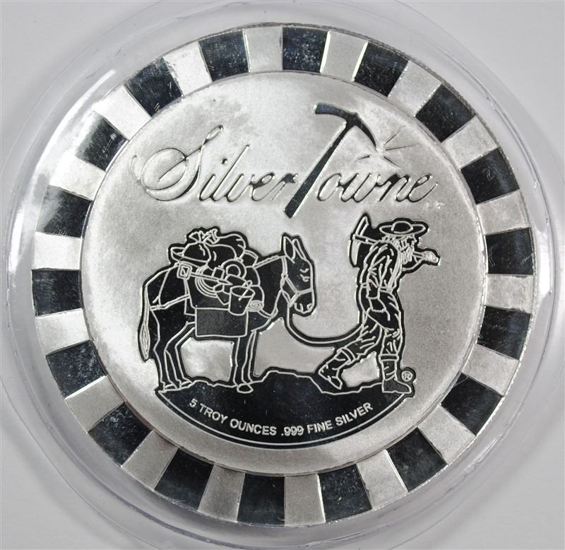 FIVE OUNCE .999 SILVER ROUND ( PROSPECTOR ) FROM SILVERTOWNE, NICE DESIGN