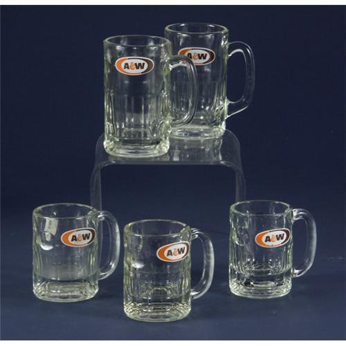 Five vintage A&W glass root beer mugs, orange and brown oval logo, to include two larger 6'' mugs and three smaller 4.5'' mugs.