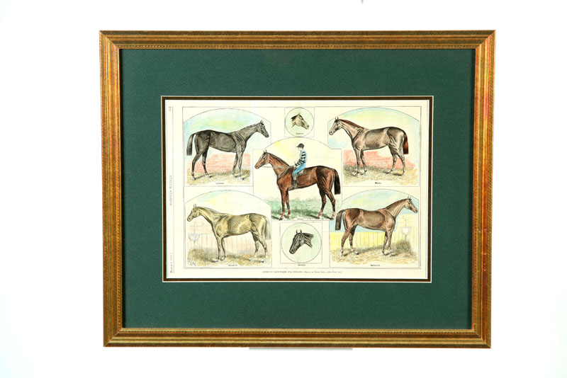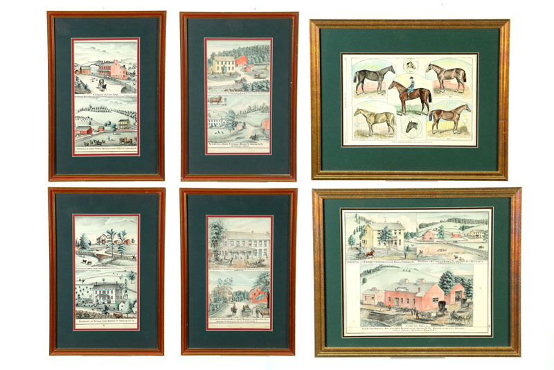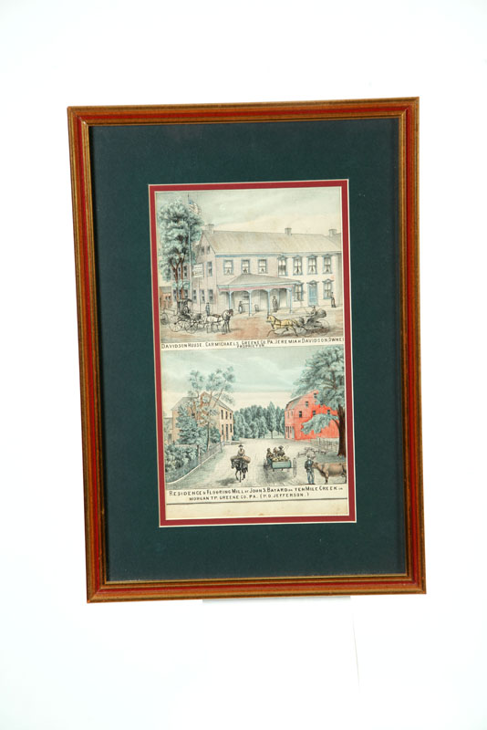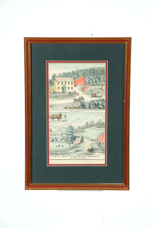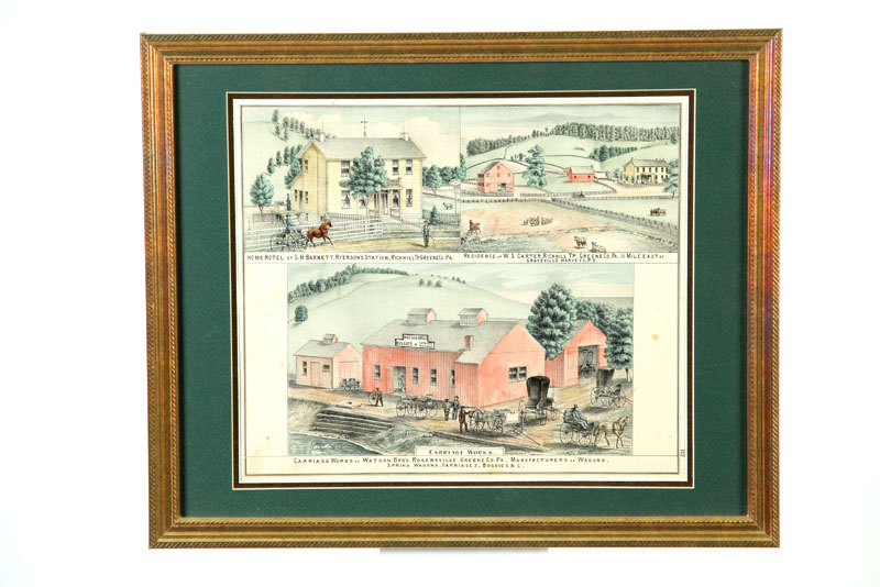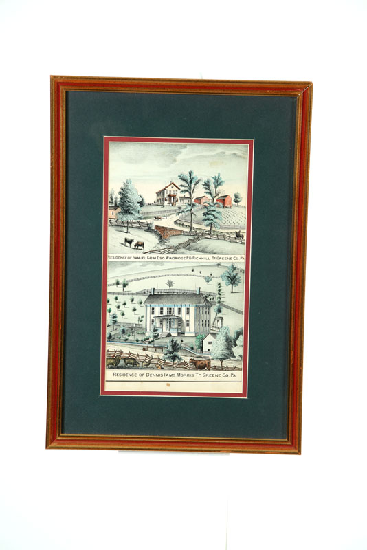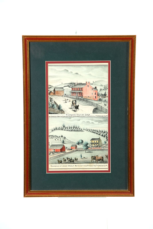Handcolored from Greene County Atlas depicting farms, residences and business. And a print from 1880 Harper's Weekly of race horses. Matted in dark green and gilt frames, 19 1/4"h. 13 1/4"w. to 17 1/2"h. 21 1/2"w.