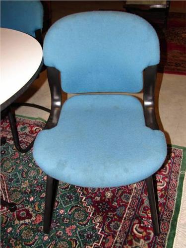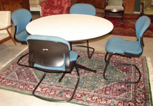 FIVE PIECE HERMAN MILLER DINETTE SET. Consists of table and four chairs with upholstered backs and seats. Upholstery on chairs shows signs of staining. Table: 28” H, 47.75” Dia. Chairs: 33.5” H to top of back, 20” W. Marked with label on underside of table.