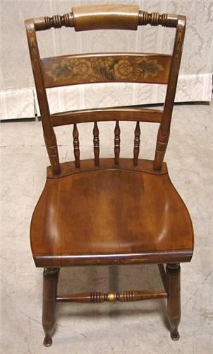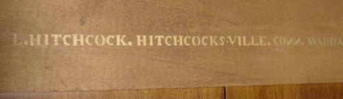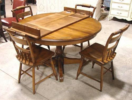 FIVE PIECE HITCHCOCK DINETTE SET. Consists of table and four chairs. Table has two extra leaves. Marked on underside of one leaf (L. Hitchcock. Hitchcocksville, Conn.” Leaf is also stamped Jan. 21, 1980. Table: 28.25” H, 48” Dia. Leaves: 10” W. Chair: 34” H to top of back, 16” W