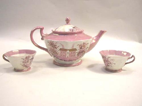 FIVE PIECES OF PINK LUSTERWARE; Schuggenwald, Czechoslovakia, comprising three cups, a covered sugar bowl and a teapot, together with other floral-decorated items (14 pieces)
