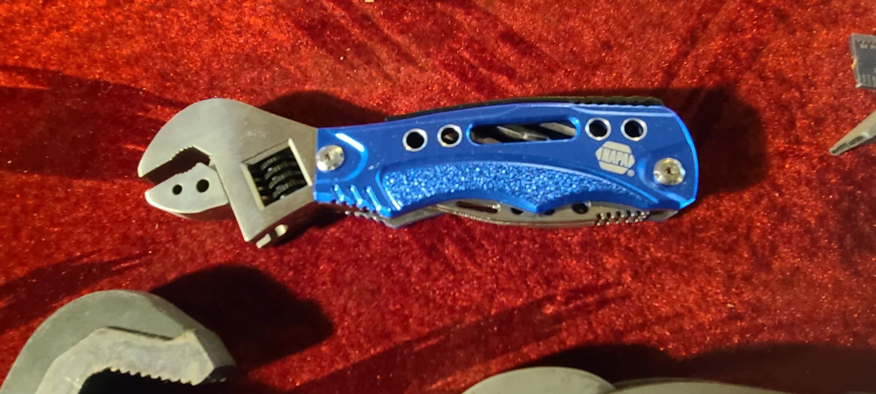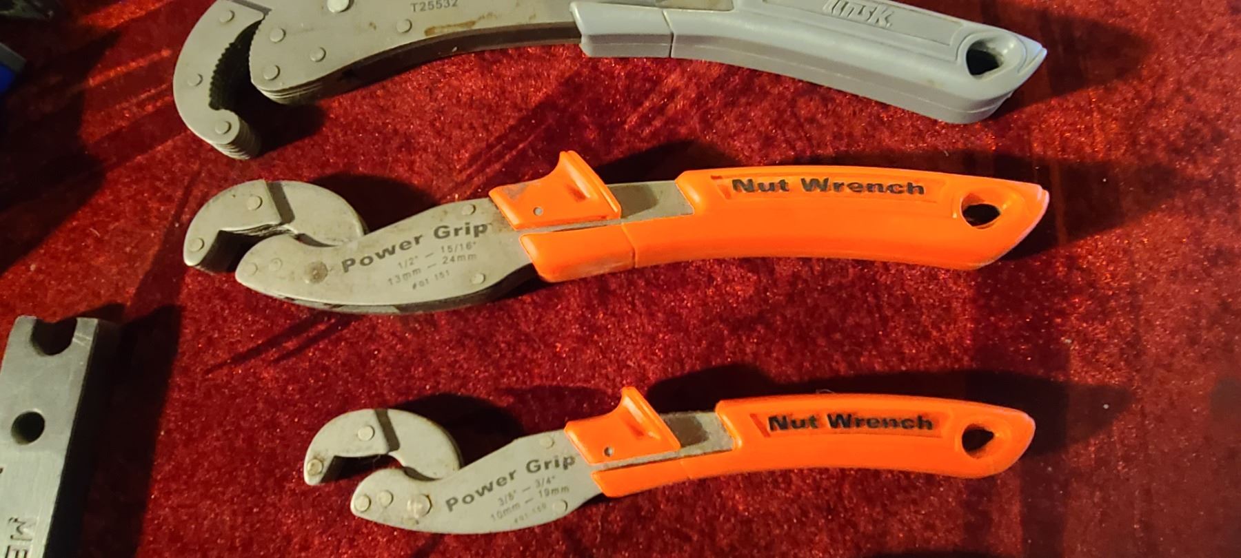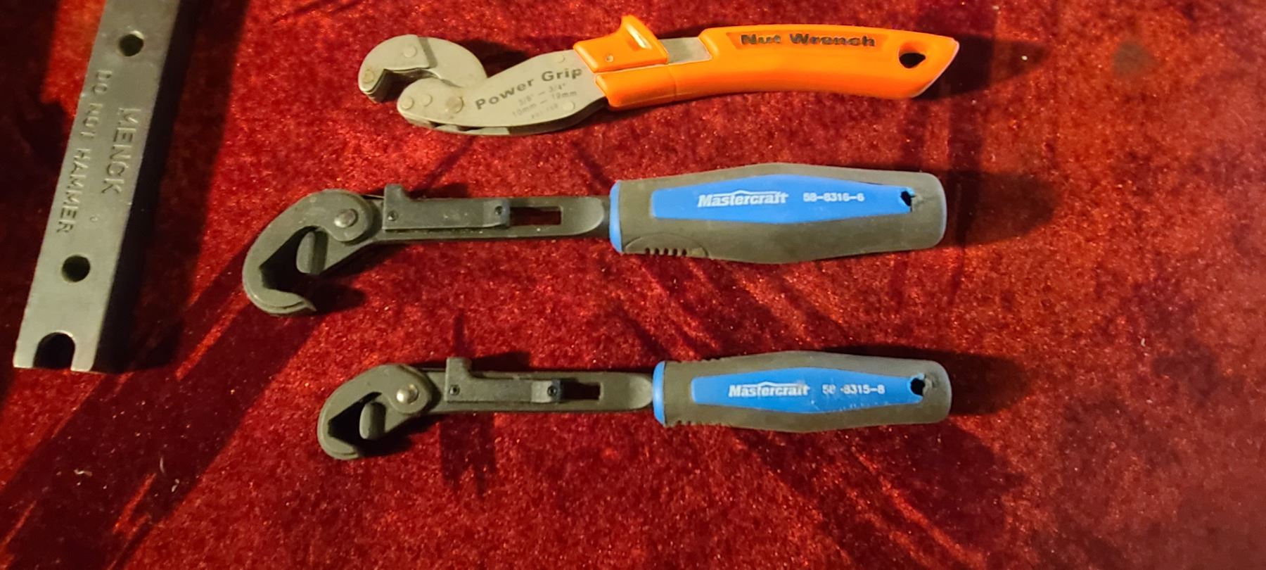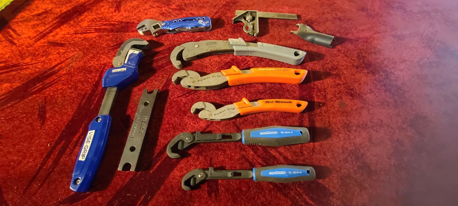 FIVE POWER GRIP NUT WRENCHES, ONE PIPE WRENCH, ONE SQUARE, AND ONE MULTI USE ADJUSTABLE WRENCH