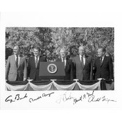 <b>313. FIVE PRESIDENTS SIGNED PHOTOGRAPH </b>Superb S.P. 10" x 8" color, a one-half length view of five Presidents standing upon a platform with the Seal of the United States displayed on a lectern, individually signed by <b>GEORGE H. BUSH</b>, <b>RONALD REAGAN</b>, <b>JIMMY CARTER</b>, <b>GERALD R. FORD</b> and <b>RICHARD NIXON</b>. Fine condition.<b>$3,000-4,000</b>